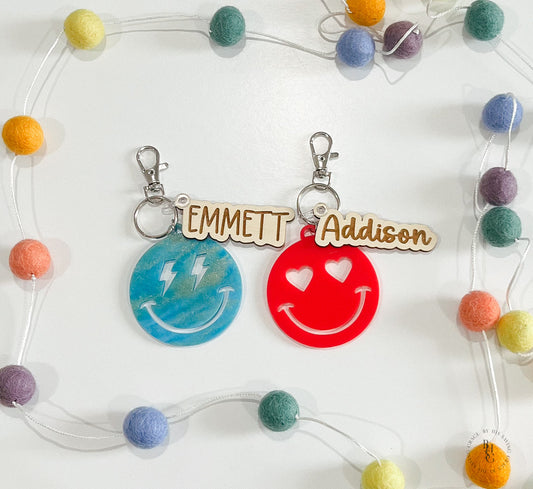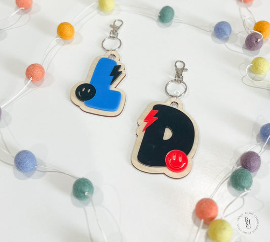 Retro Letter Keychain With Smiley Face & Lightening Bolt