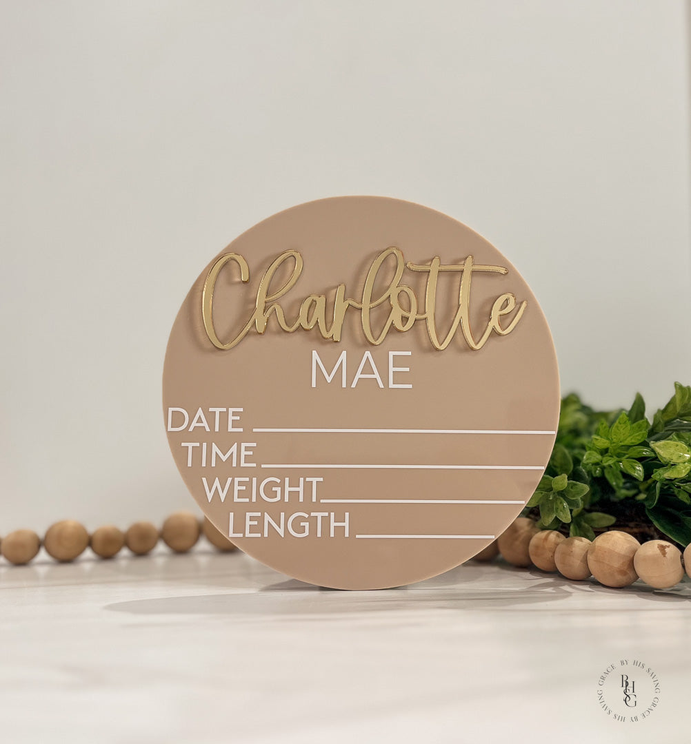 These beautiful tan acrylic arch monthly milestones feature a gold mirror 3D number and UV print for the words month, months, and year. The UV-printed word is not vinyl but permanent ink, making the words very sleek! These adorable acrylic monthly milestone discs are perfect for documenting your baby's monthly milestone pictures! The birth stat sign is a perfect way to announce the arrival of your little one and will make a great keepsake that will last for years to come.