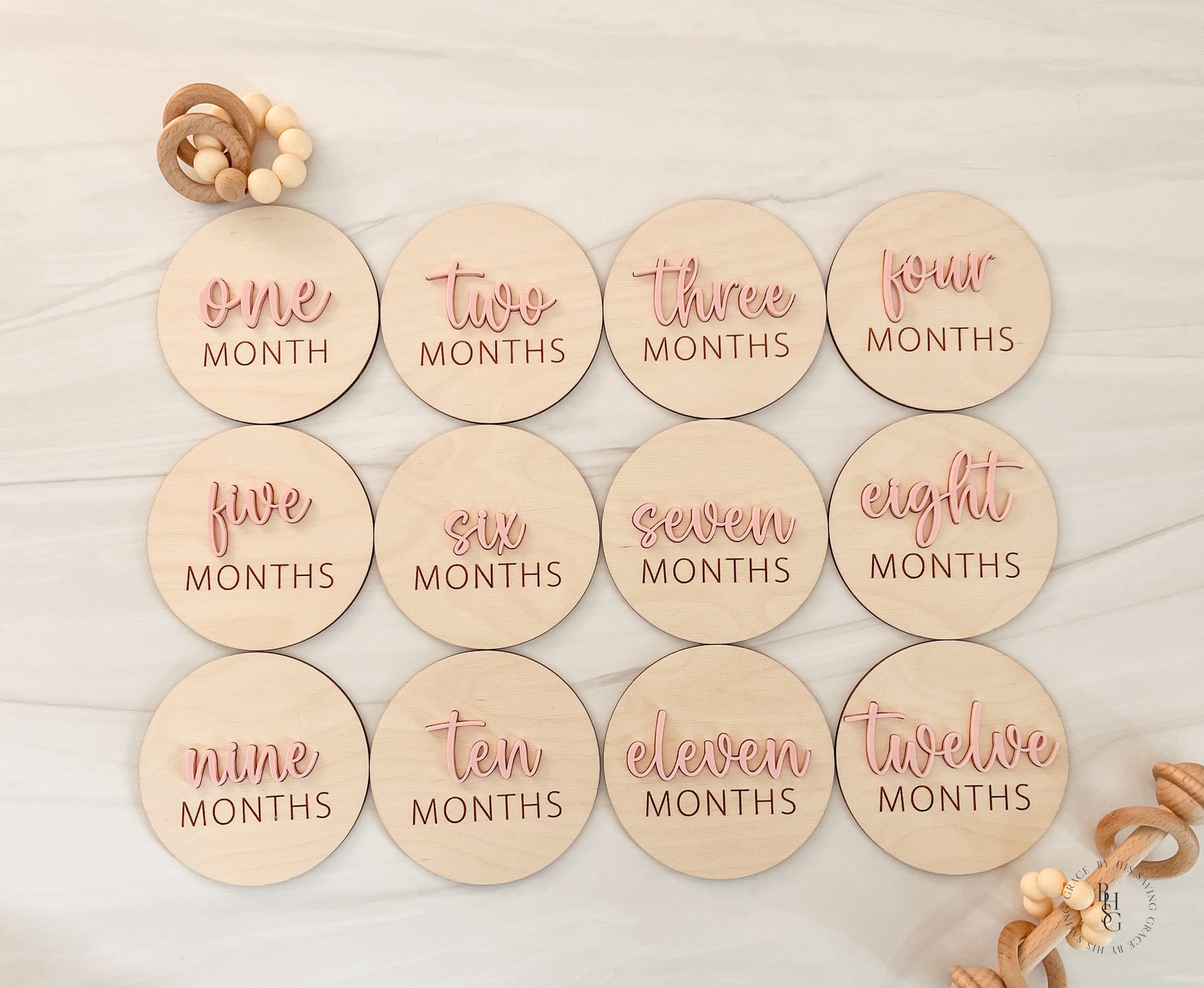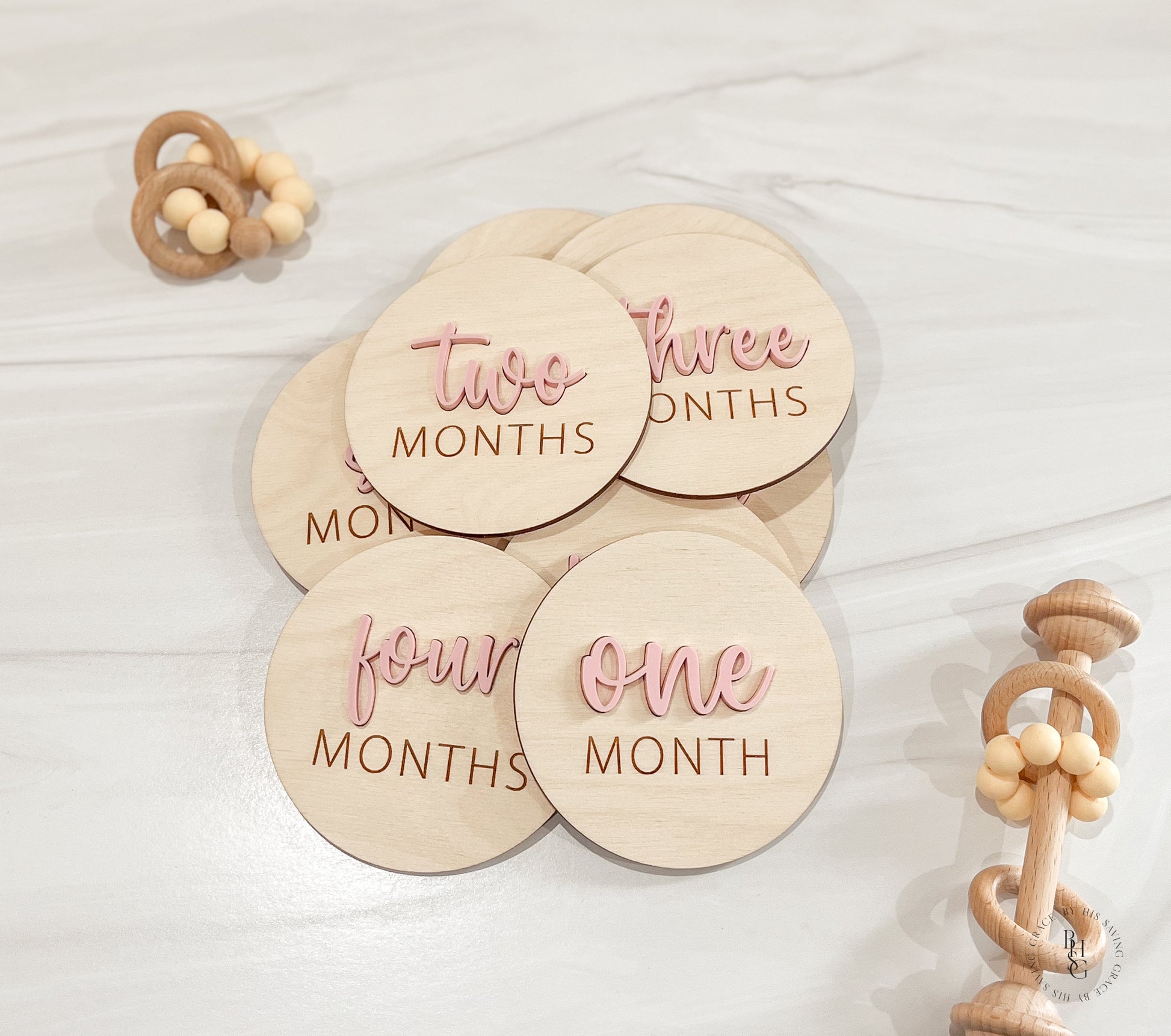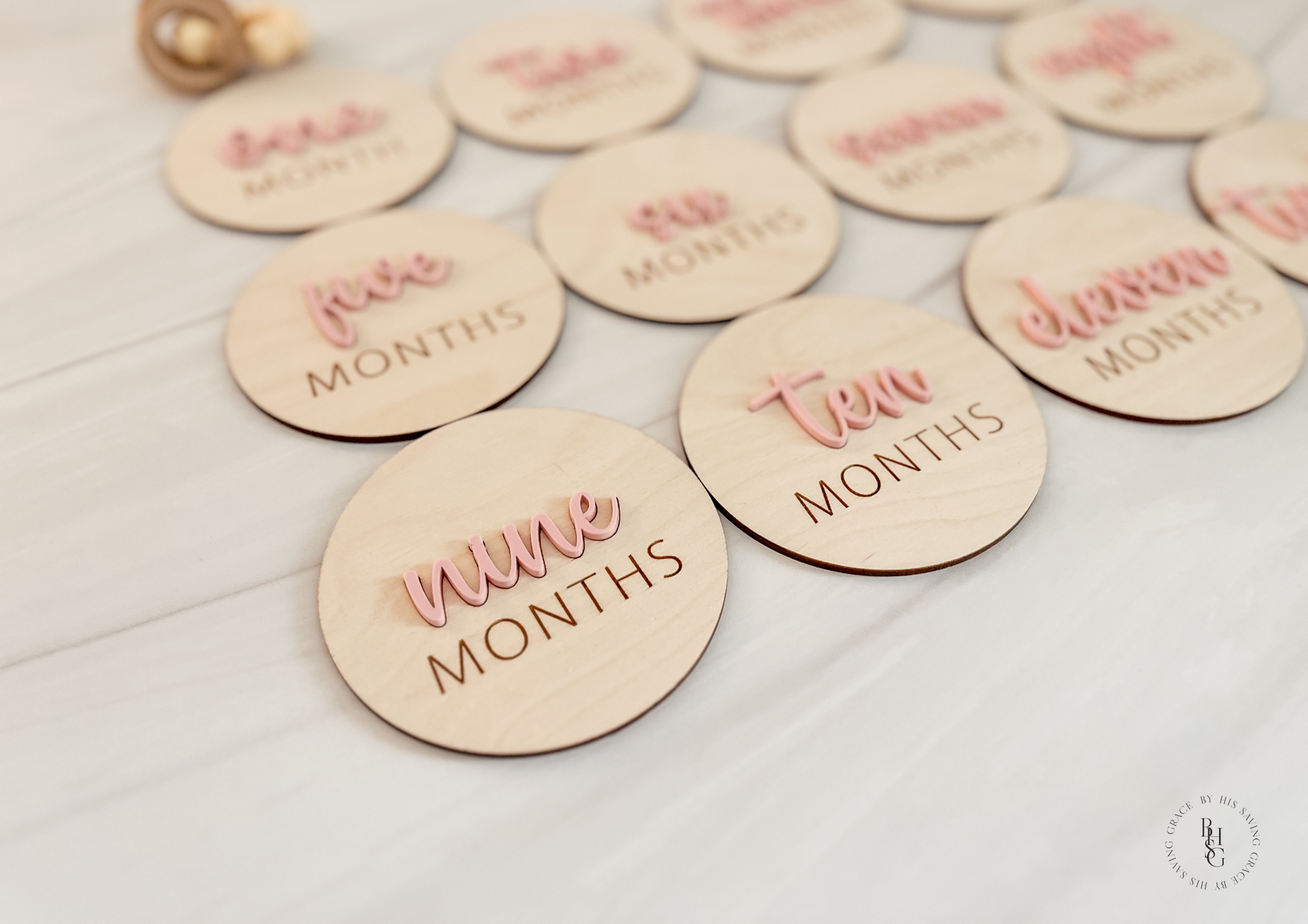 3D Wooden Monthly Milestone Discs For Baby Photos with Light Pink Acrylic Month