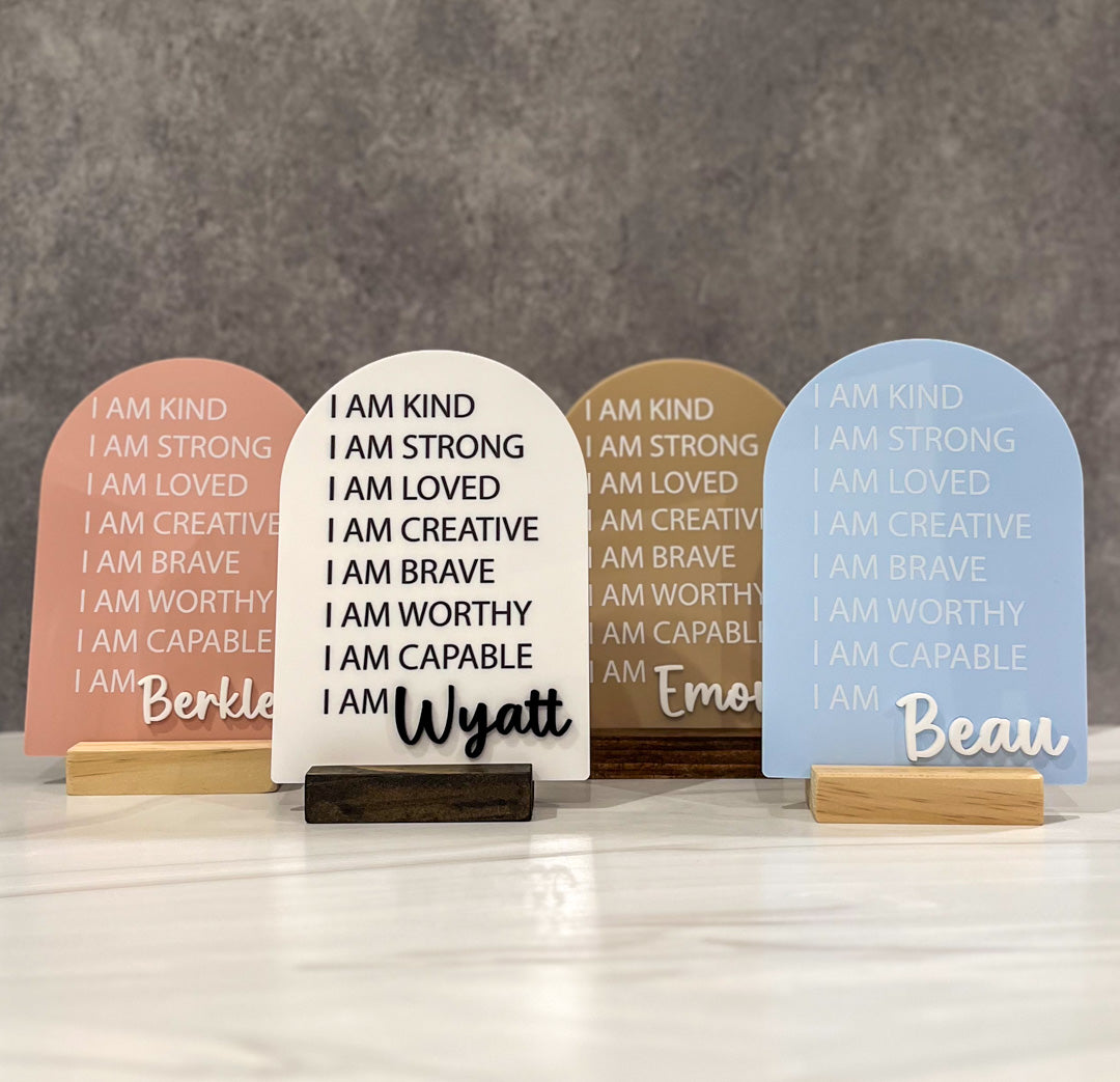 Our beautiful laser-cut acrylic affirmations sign features UV-printed words and a 3D acrylic name. UV-printed words are permanent ink and will not crack or come off like vinyl can. It makes a great gift and will become a keepsake that will last for years to come.