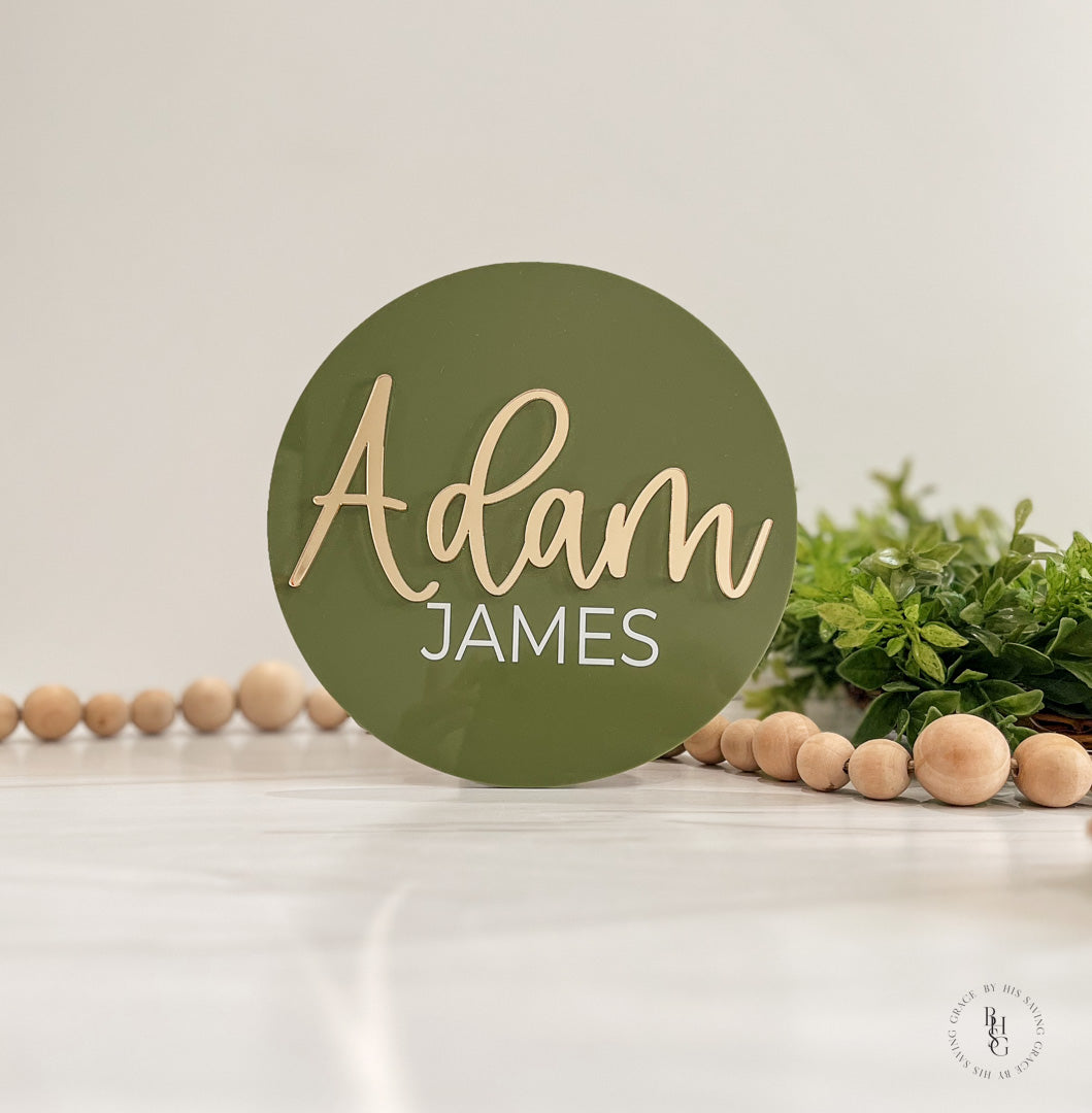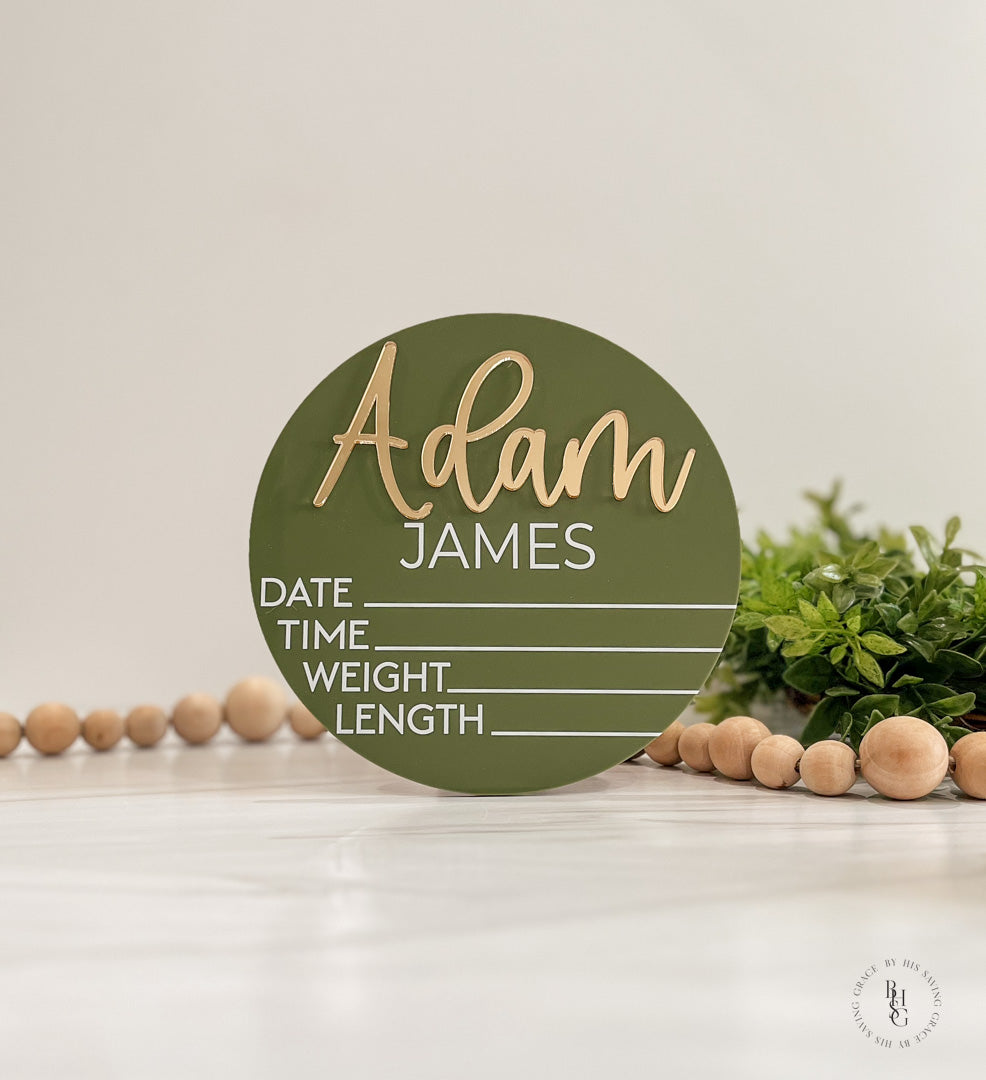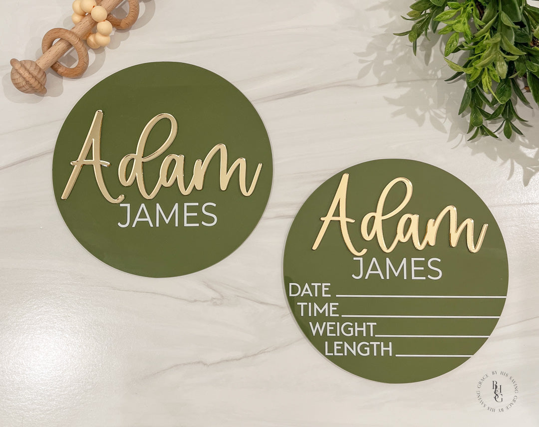 Our laser-cut and UV printed baby announcement sign features a sage acrylic nameplate with gold mirror 3D acrylic for the first name and UV print for the second name and remaining text. The UV-printed word is not vinyl but permanent ink, making the words very sleek! You will have the option to purchase the nameplate sign, the birth stat sign, or both! This is a perfect way to announce the arrival of your precious baby and fits perfectly in a hospital crib next to your little one.