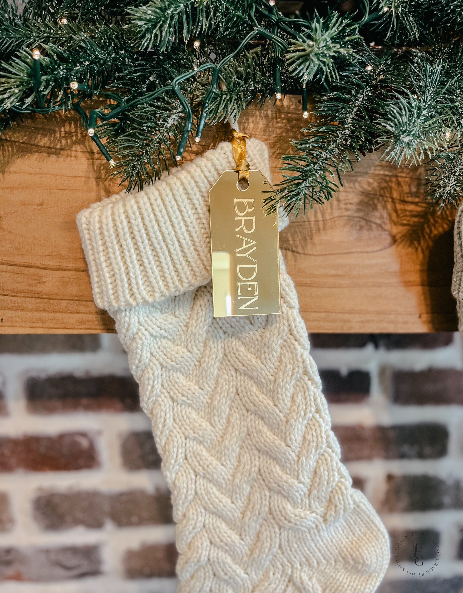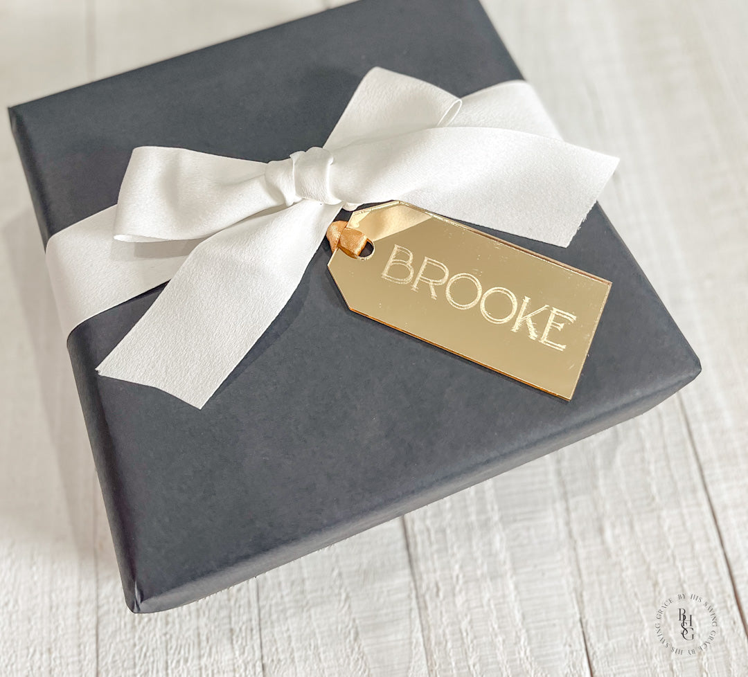 Our beautiful mirror gold acrylic laser-cut stocking tag is engraved with your name of choice. The tags also make great gift tags.