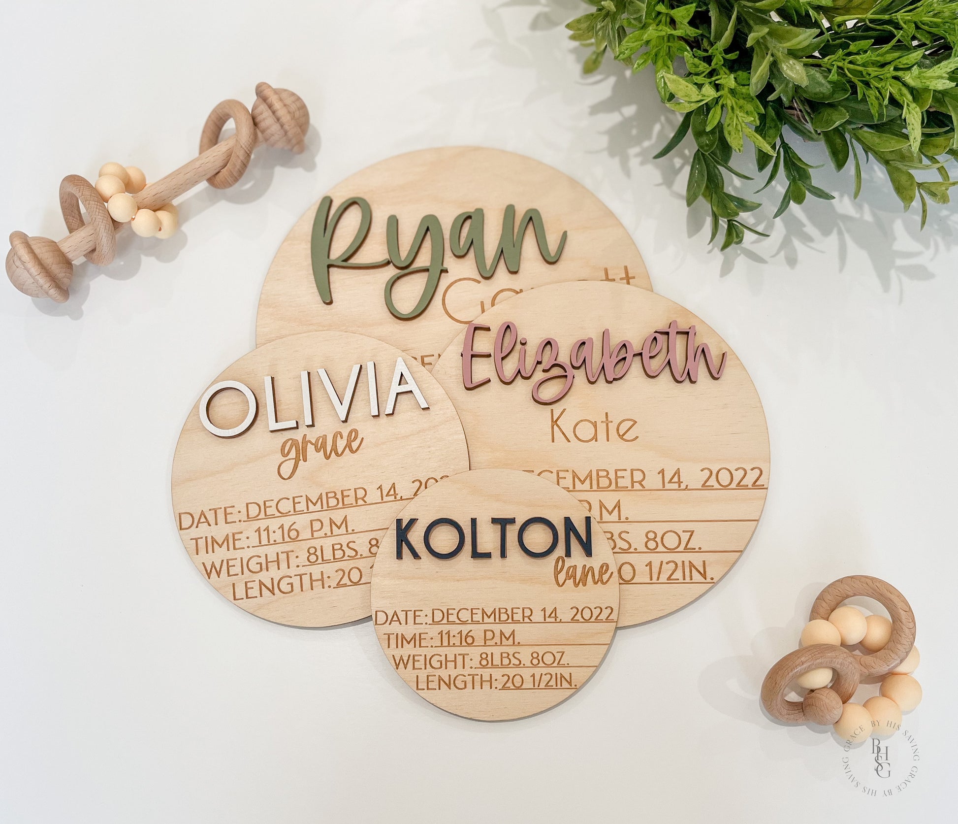 Our laser-cut and engraved baby announcement sign features 3D wooden letters for the first name, engraved letters for the second name, and remaining text. If you're worried about messing up on your baby's announcement sign, let us engrave them for you! These make for great photo ops in newborn photo shoots.