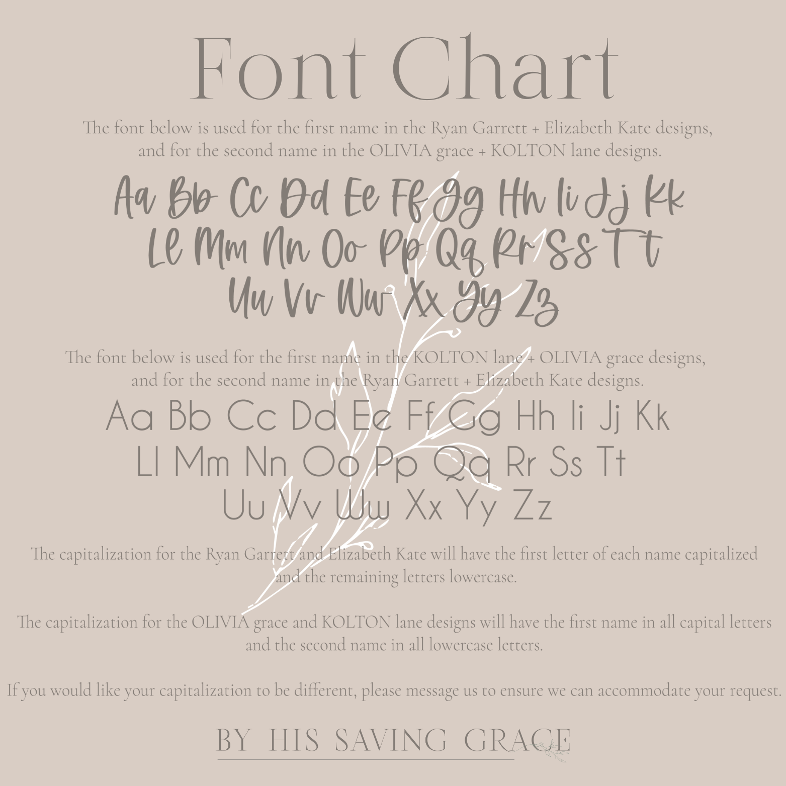 The samples' colors are: Ryan Garrett is Sage, Elizabeth Kate is Vintage Rose, OLIVIA grace is White, and KOLTON lane is Navy.