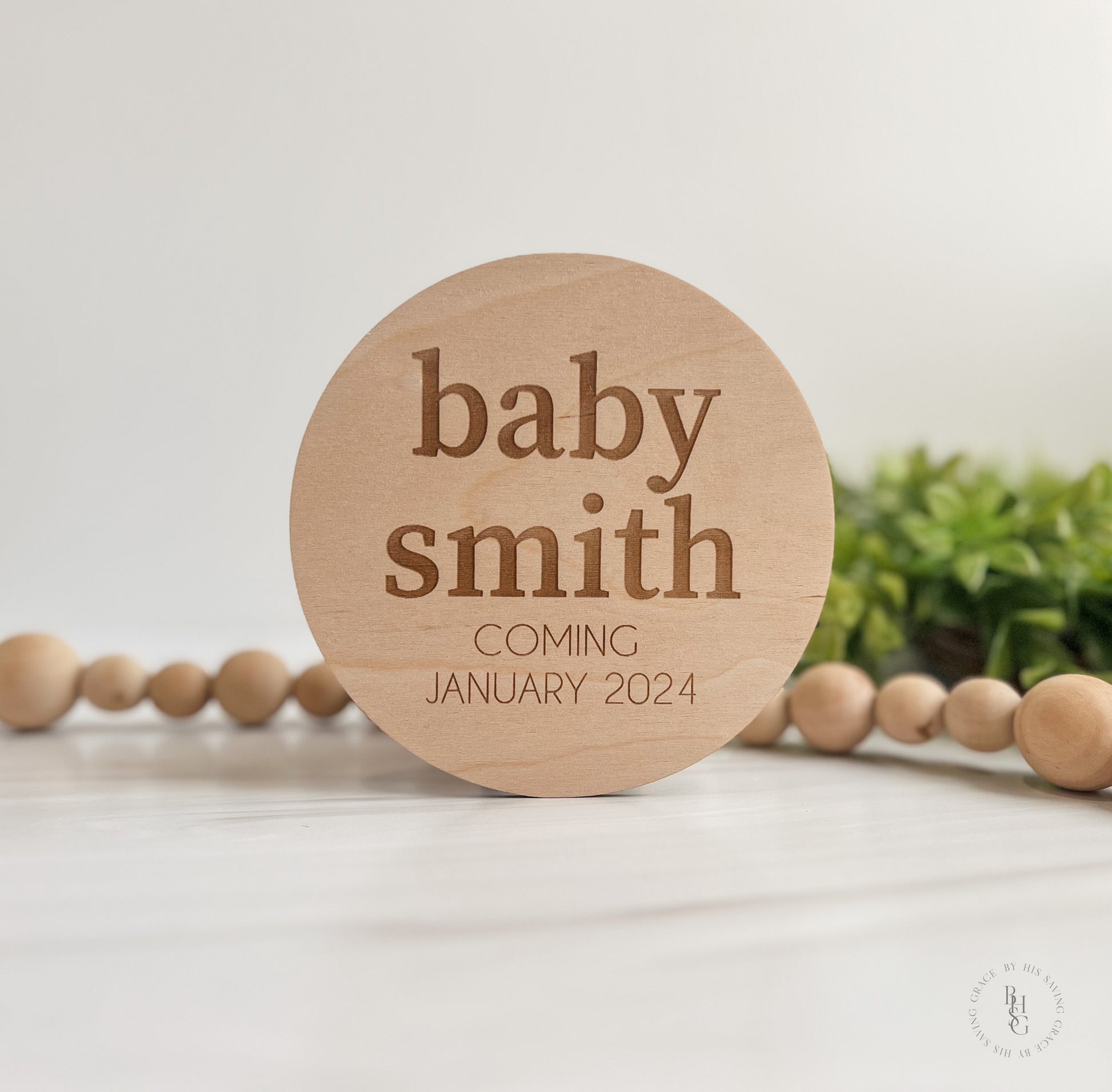 Announce your pregnancy with our laser-cut and engraved pregnancy announcement sign. Personalize with your name and date of choice.