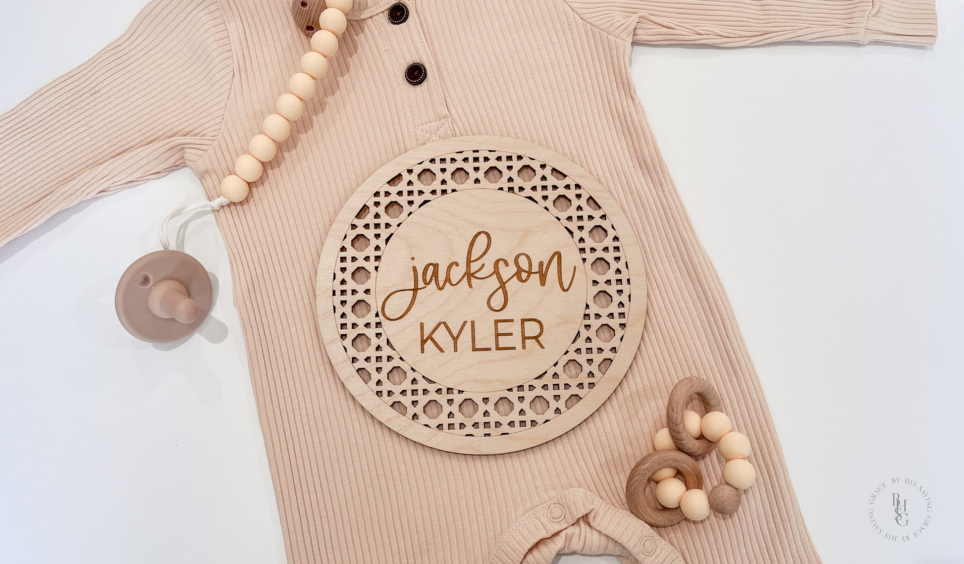 Wooden Boho Rattan Baby Name Announcement Sign