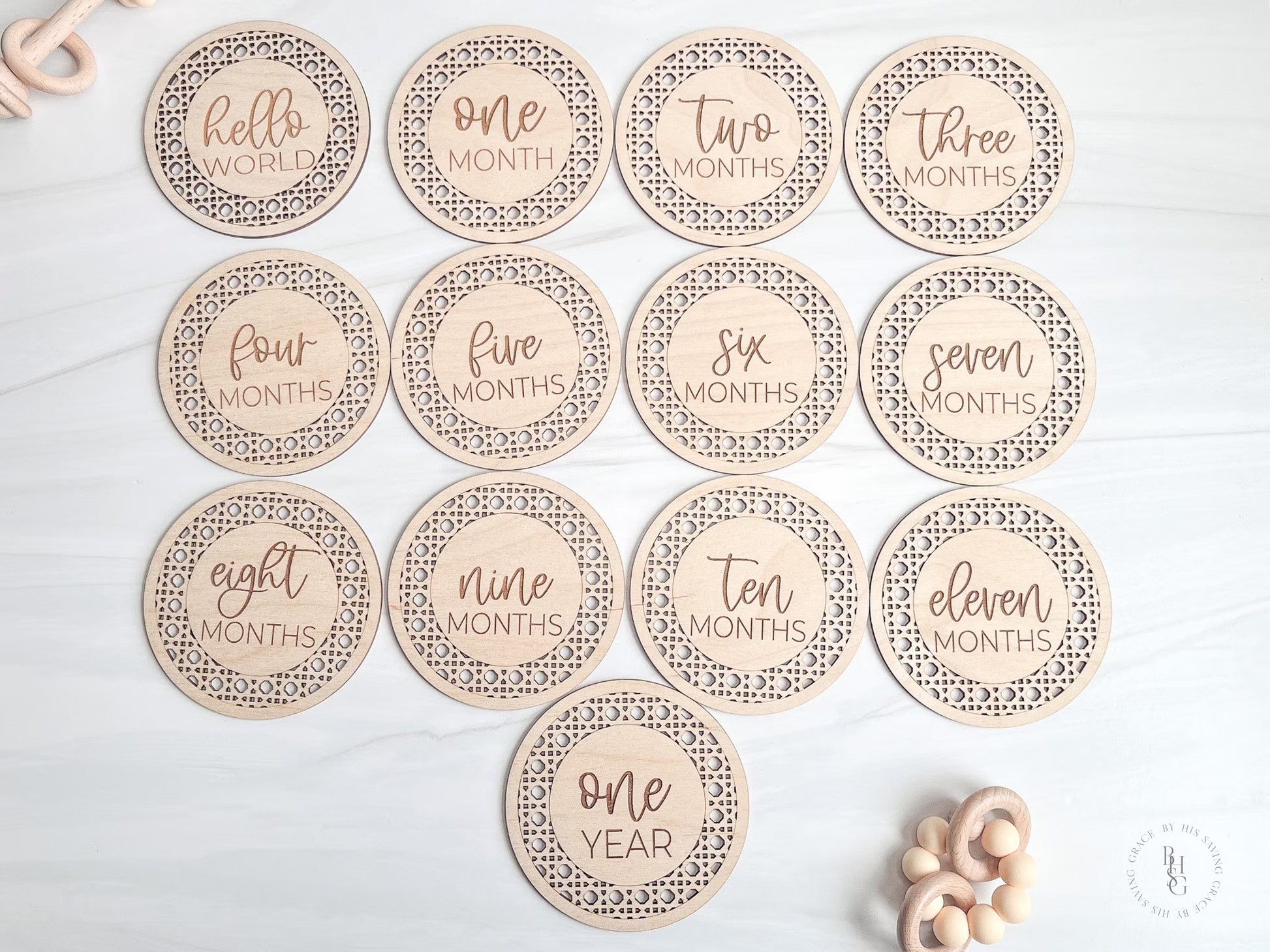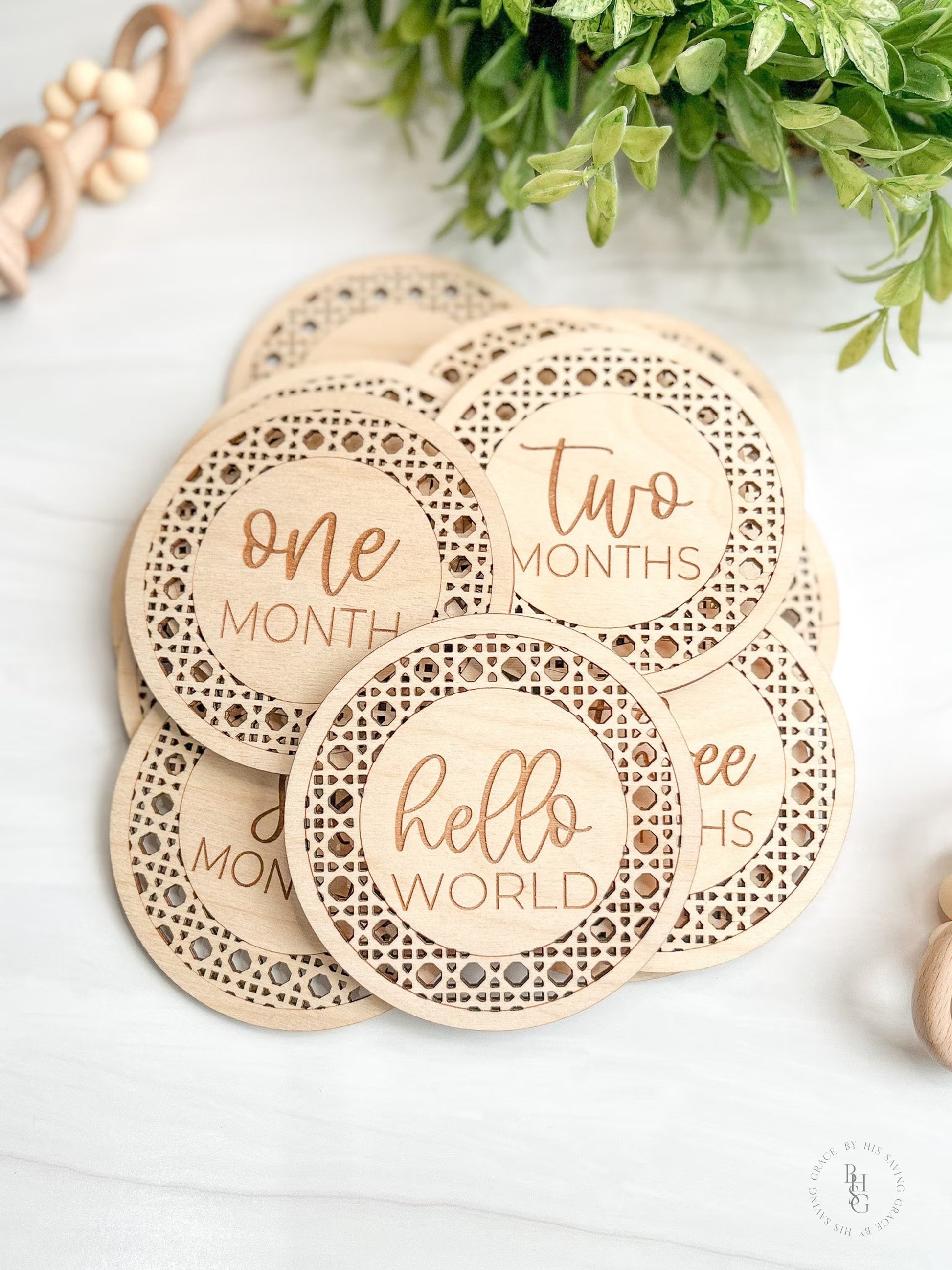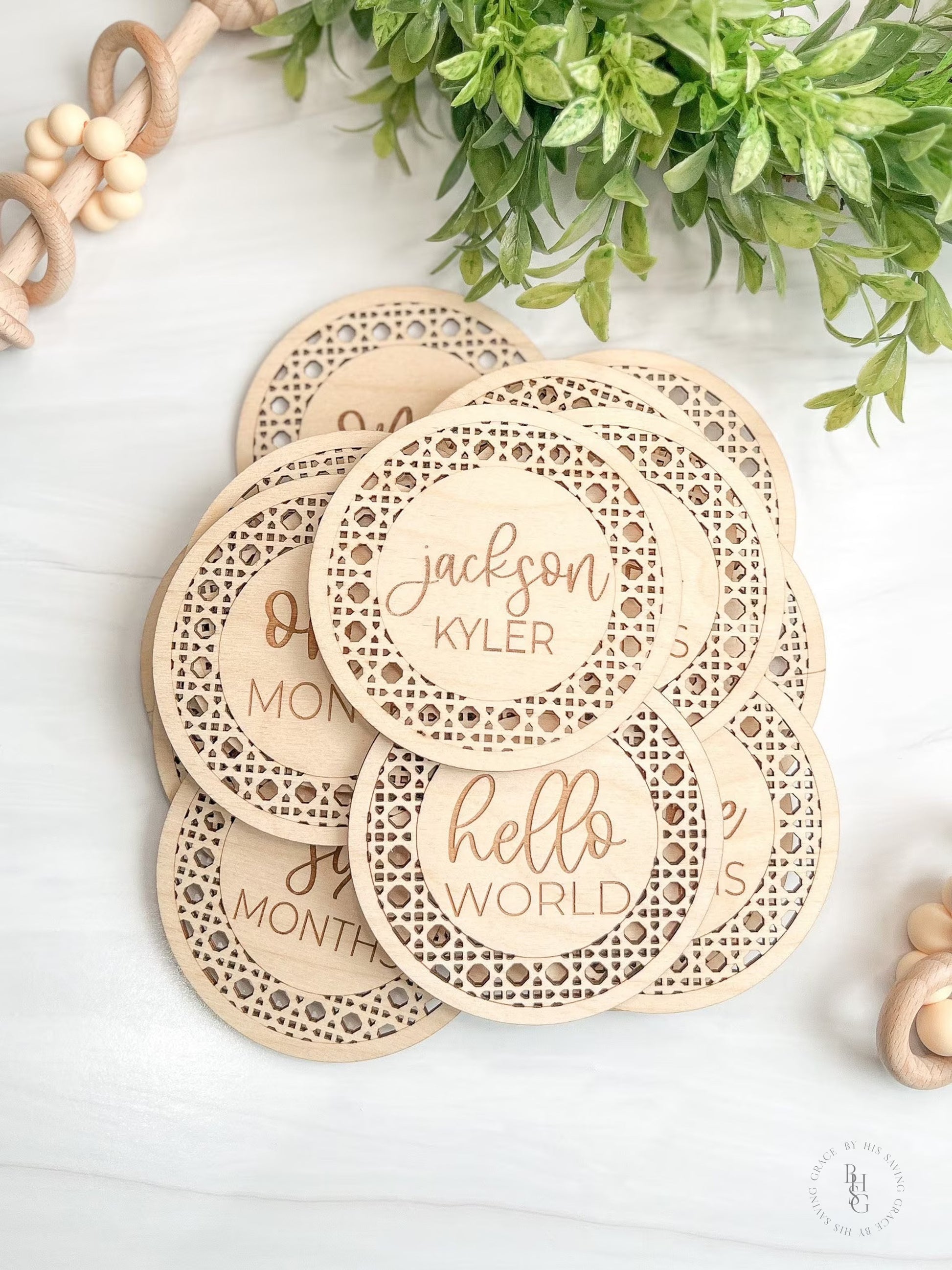 Boho Rattan Wooden Monthly Milestone Discs For Baby Photos + Matching Nameplate