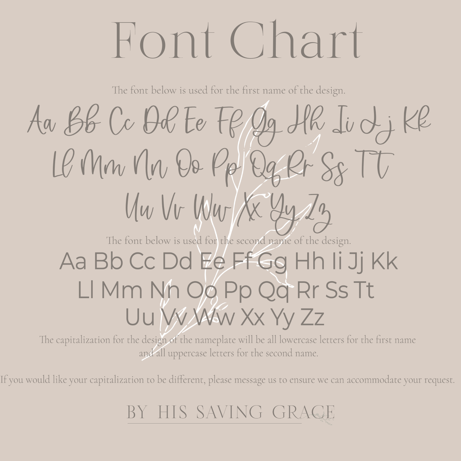 The spacing and size of the names will vary based on the characters and number of characters in the name. A digital proof of how your nameplate will look can be purchased here.