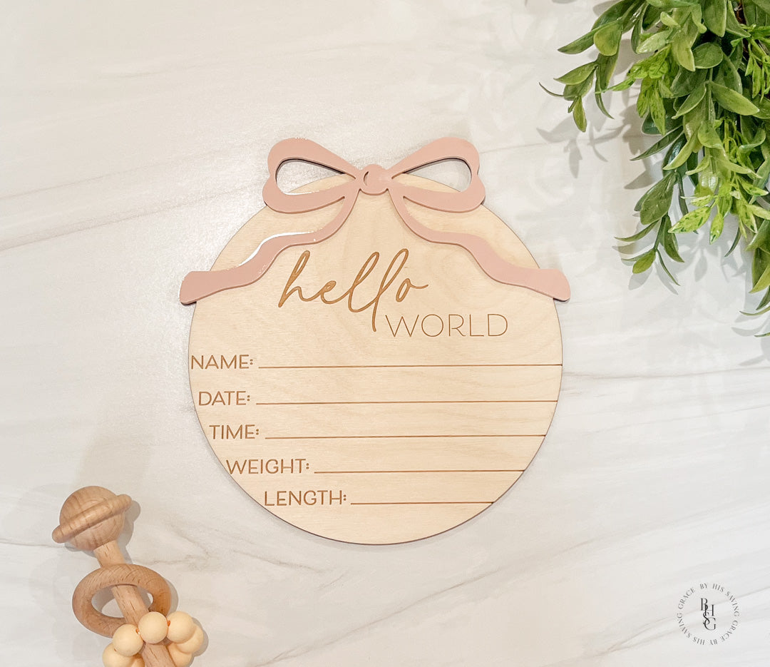 Wooden Hello World Baby Announcement Sign With Birth Stats and Acrylic Bow