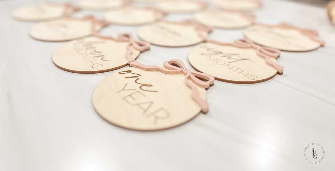 Calling all girl mommas! These adorable bow monthly milestone makers are a must-have to document your baby's first year! This set includes 13 laser-cut and engraved wooden monthly milestone markers and features an acrylic bow in your choice of color.
