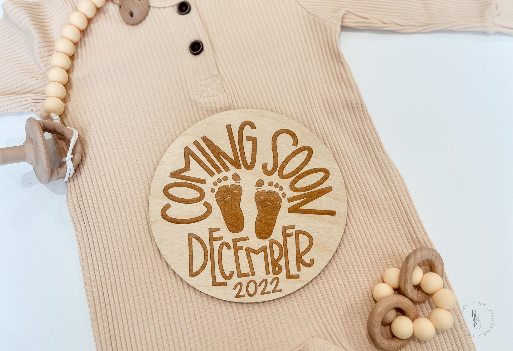 Announce your pregnancy with our laser-cut and engraved "COMING SOON" announcement. Personalize with your date of choice.