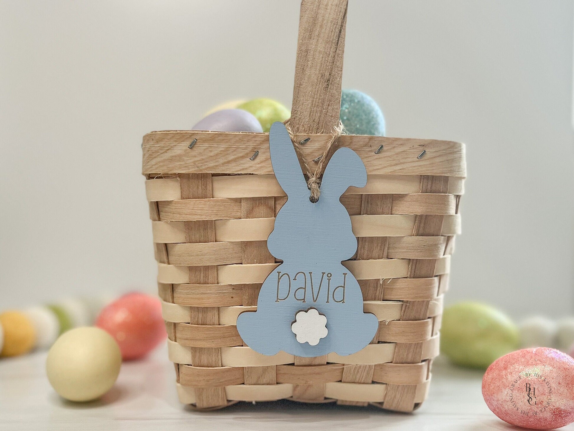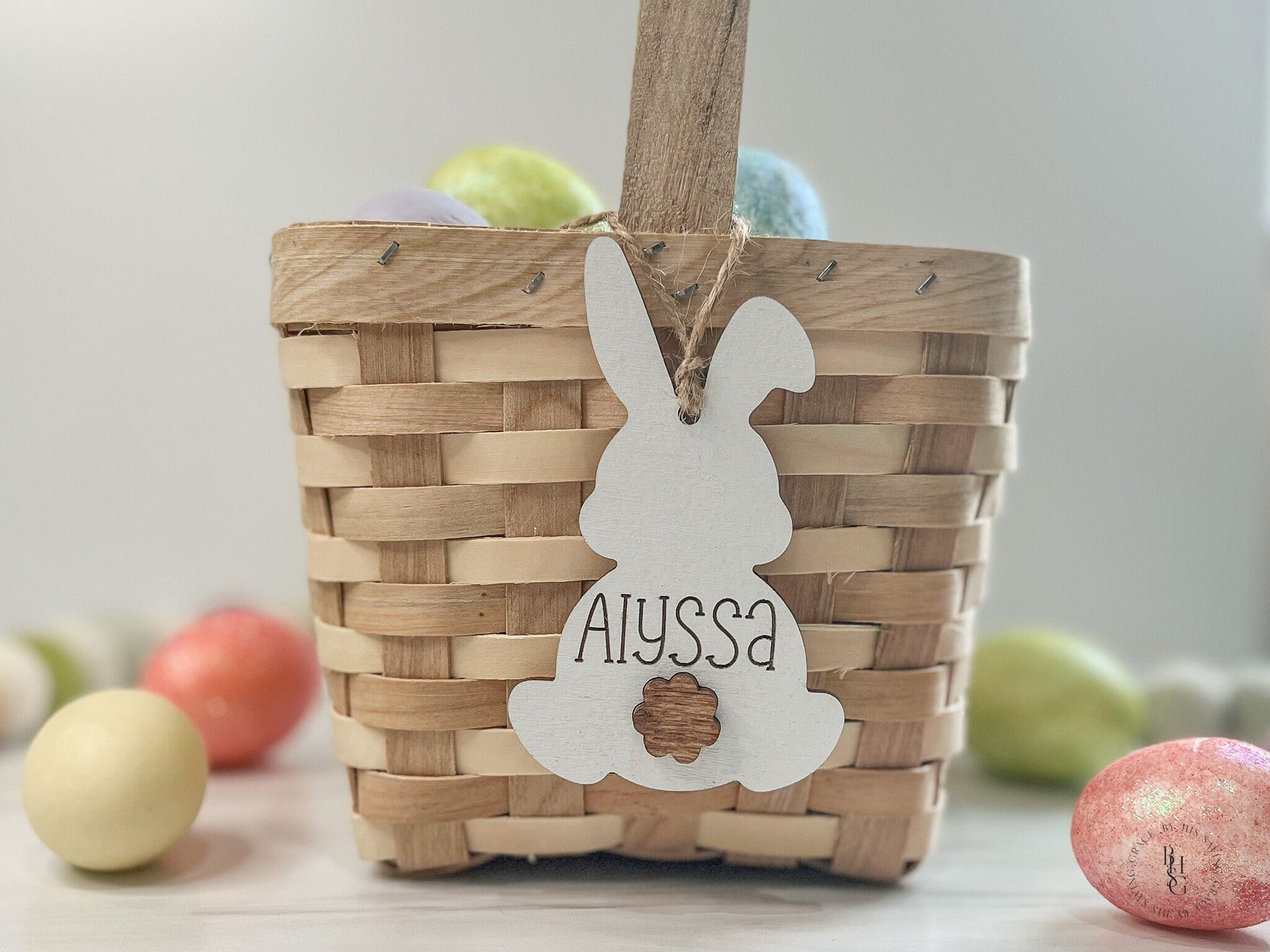 Our laser-cut Cotton Tail Easter Bunny tag is made from high-quality wood and engraved with your name of your choice. Add this tag to an Easter basket and you have a piece that will last for years to come!