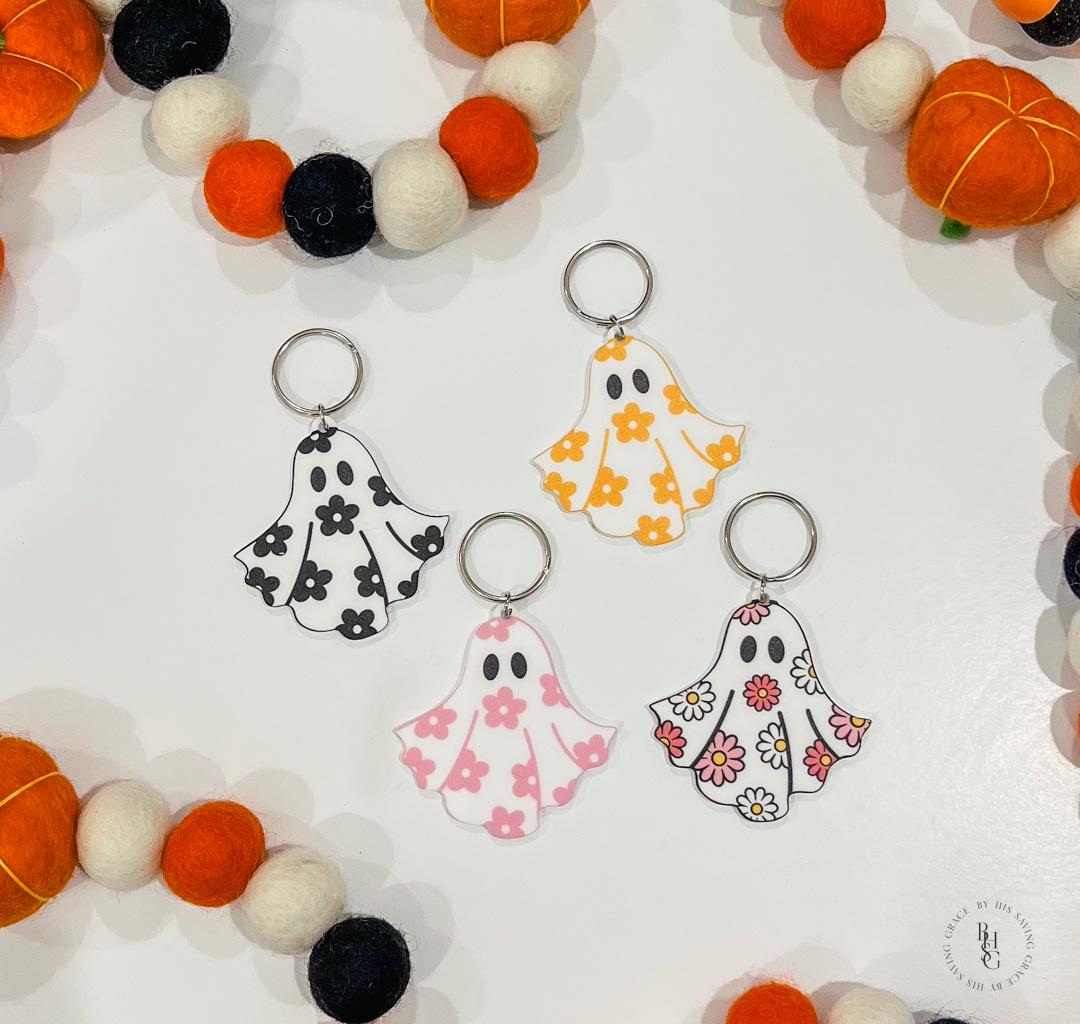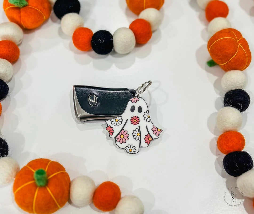 Add a little spooky vibes to your keys with this adorable, lightweight acrylic daisy ghost tag keychain featuring a UV-printed design in your choice of color!