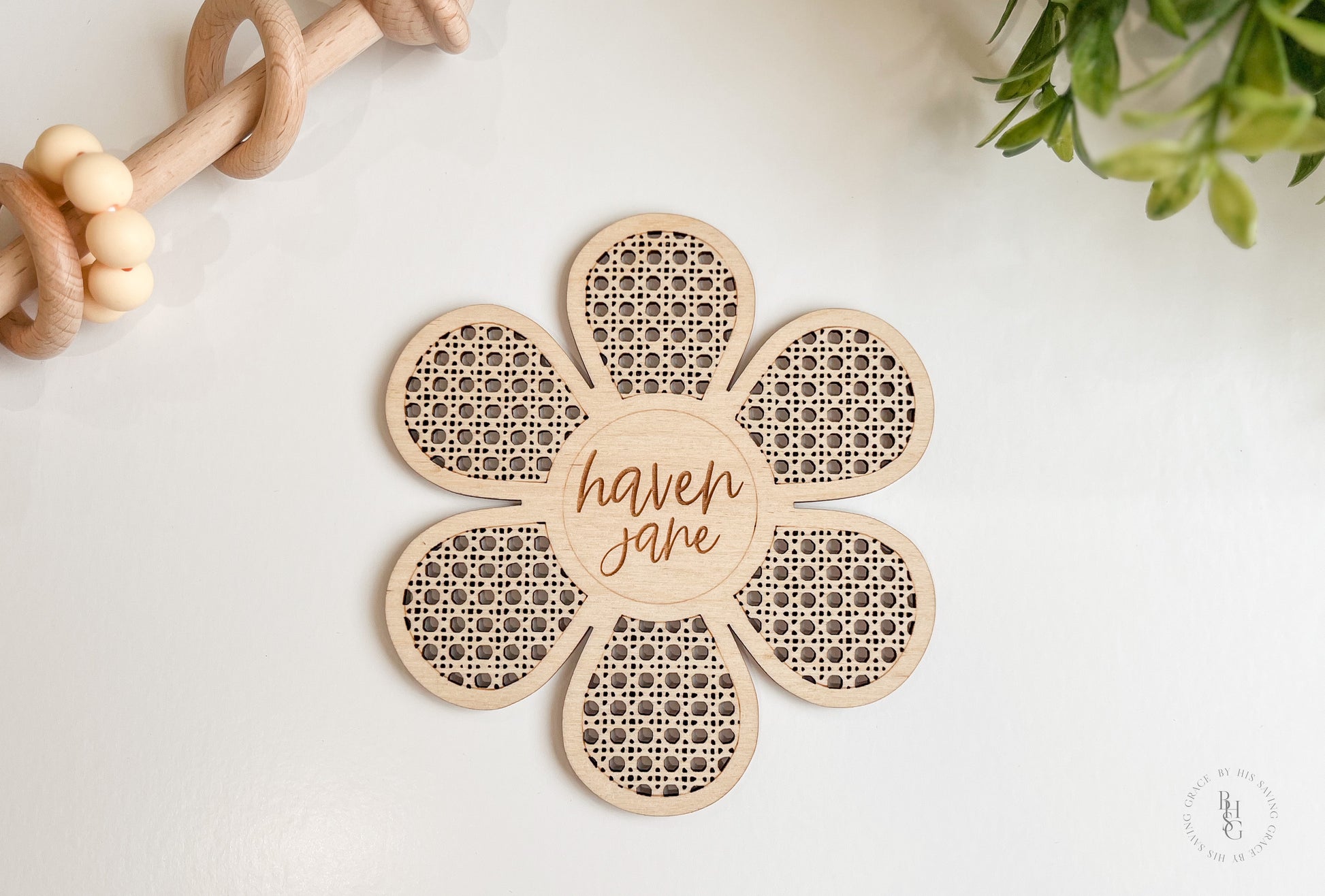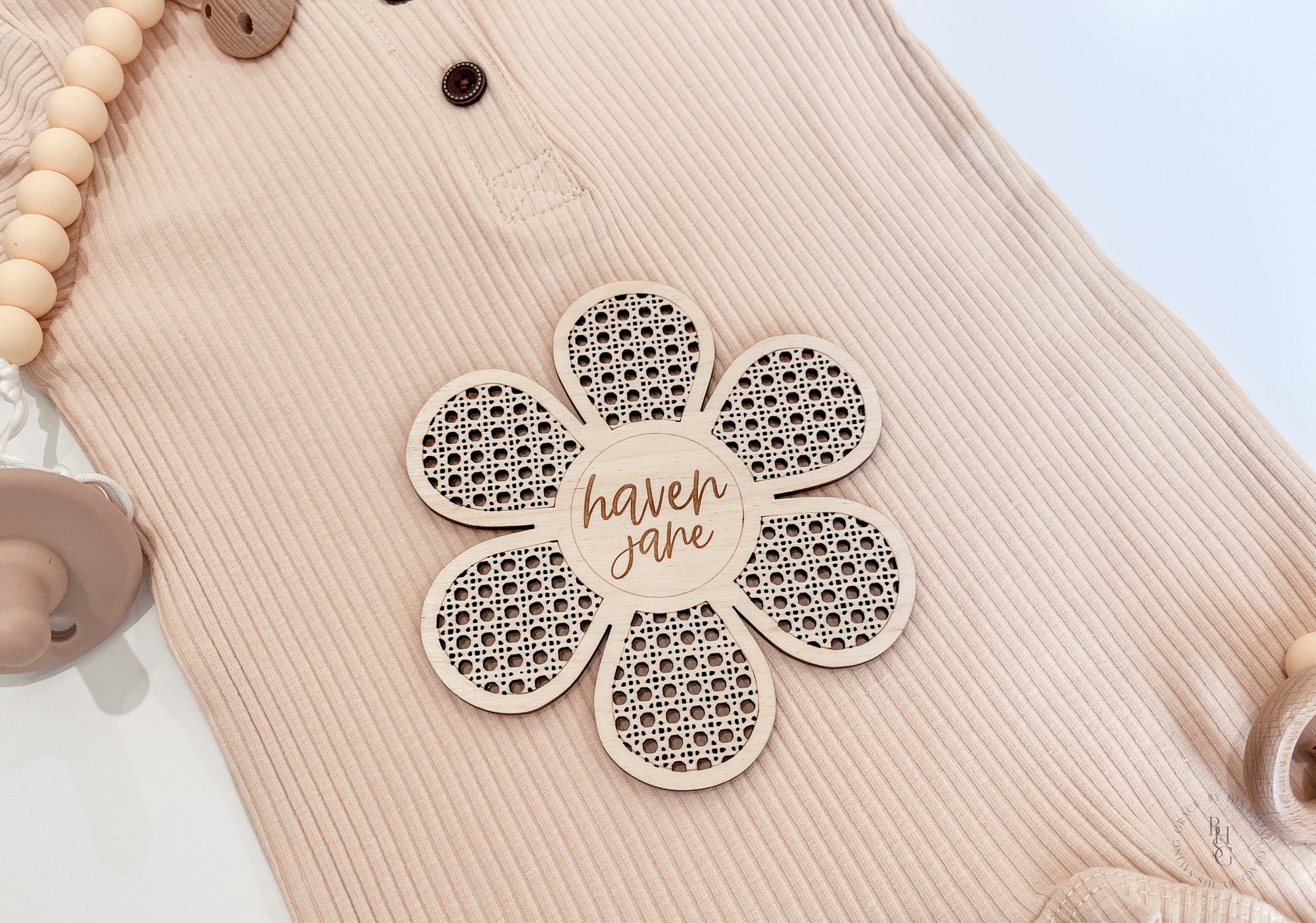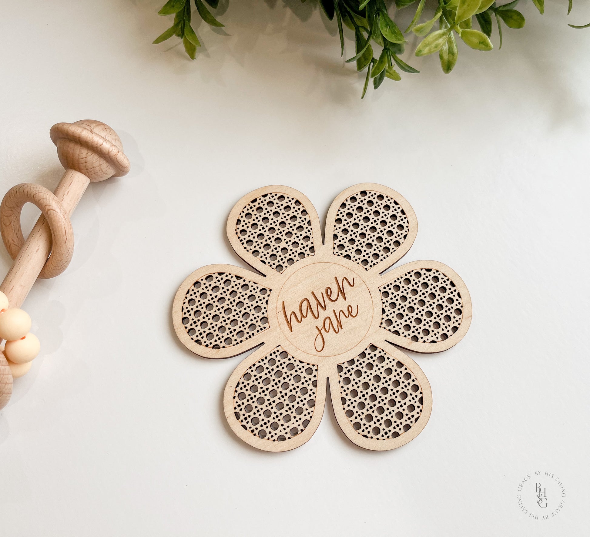 Wooden Daisy Rattan Baby Name Announcement Sign