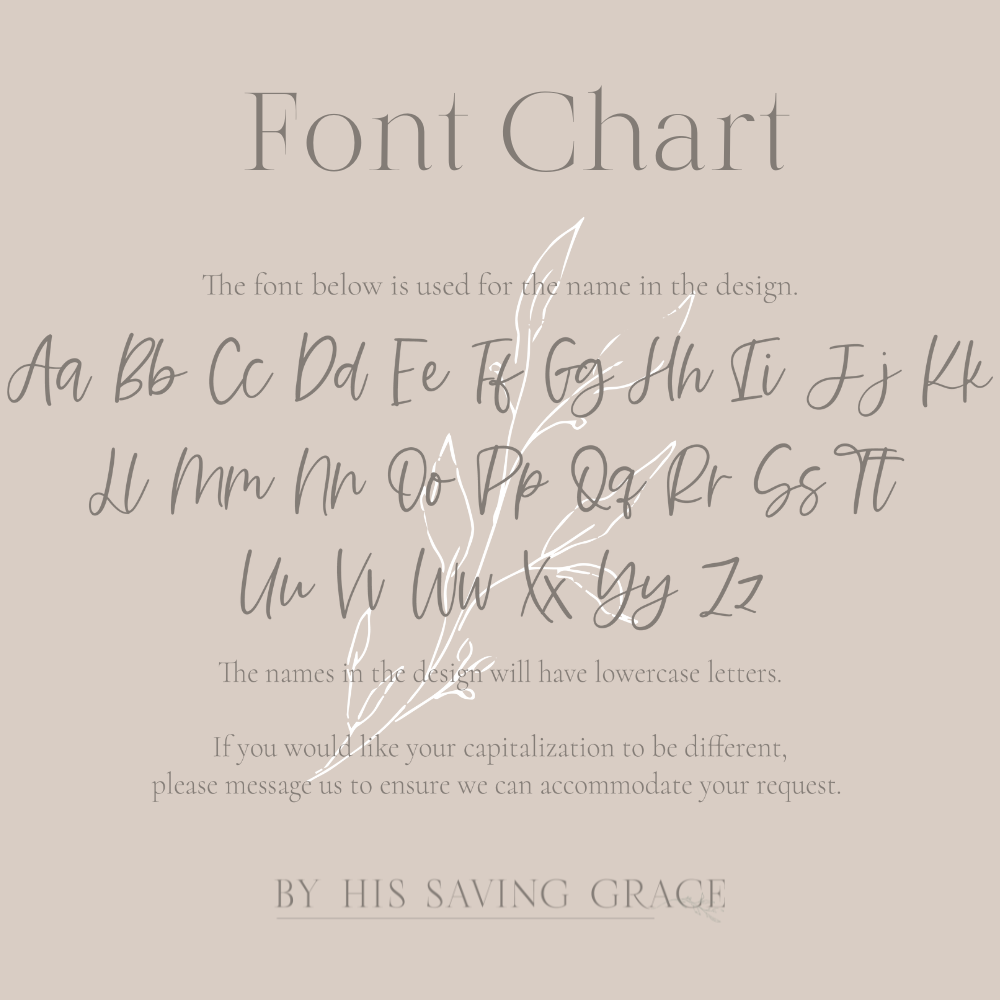 The spacing and size of the names will vary based on the characters and number of characters in the name. A digital proof of how your nameplate will look can be purchased here.