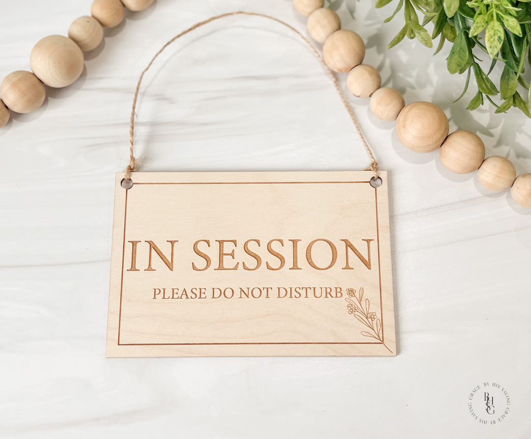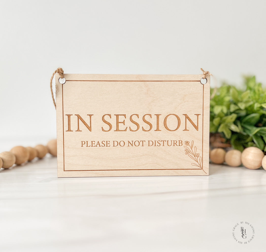 Our double-sided In Session + Welcome Door sign is a perfect for hanging on the door knob and politely lets your clients know your availability.