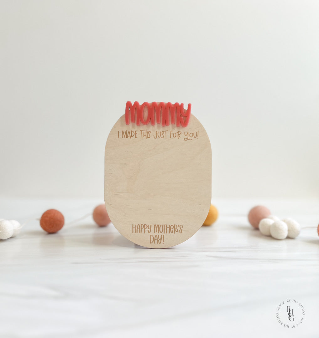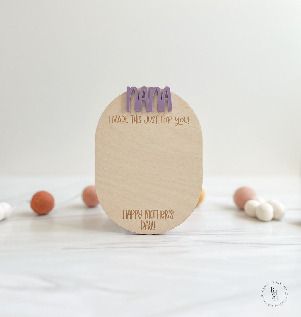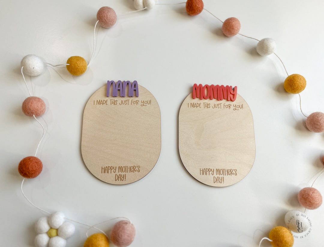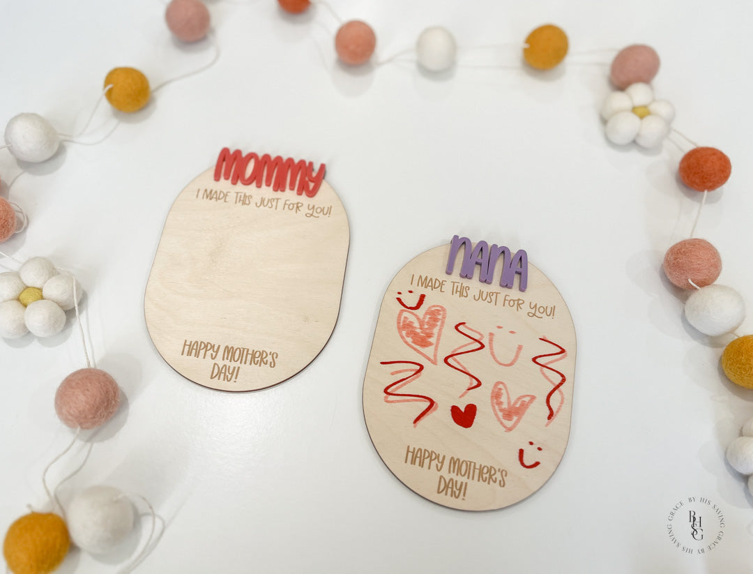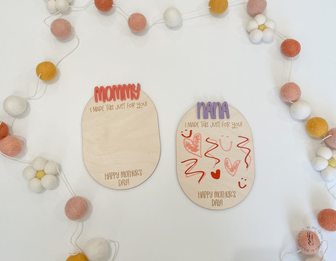 Our laser-cut and engraved Happy Mother's Day magnet features an acrylic name and space for your little one to draw a picture! This magnet is a perfect keepsake to showcase any drawing or words your little ones want to make for you or any mom in their life! We recommend using crayon or map pencils to draw on the magnet.