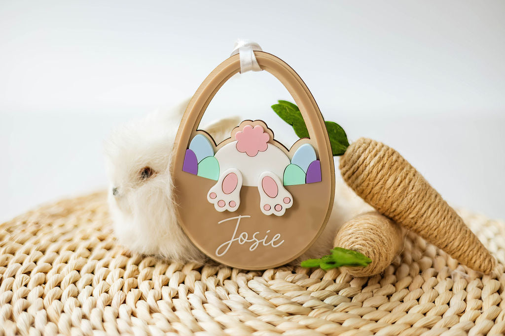 Our laser-cut Easter Basket tag is made from high quality wood + acrylic and personalized with a UV-printed name of your choice. Add this tag to an Easter basket and you have a piece that will last for years to come!
