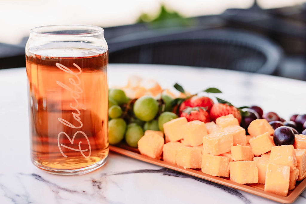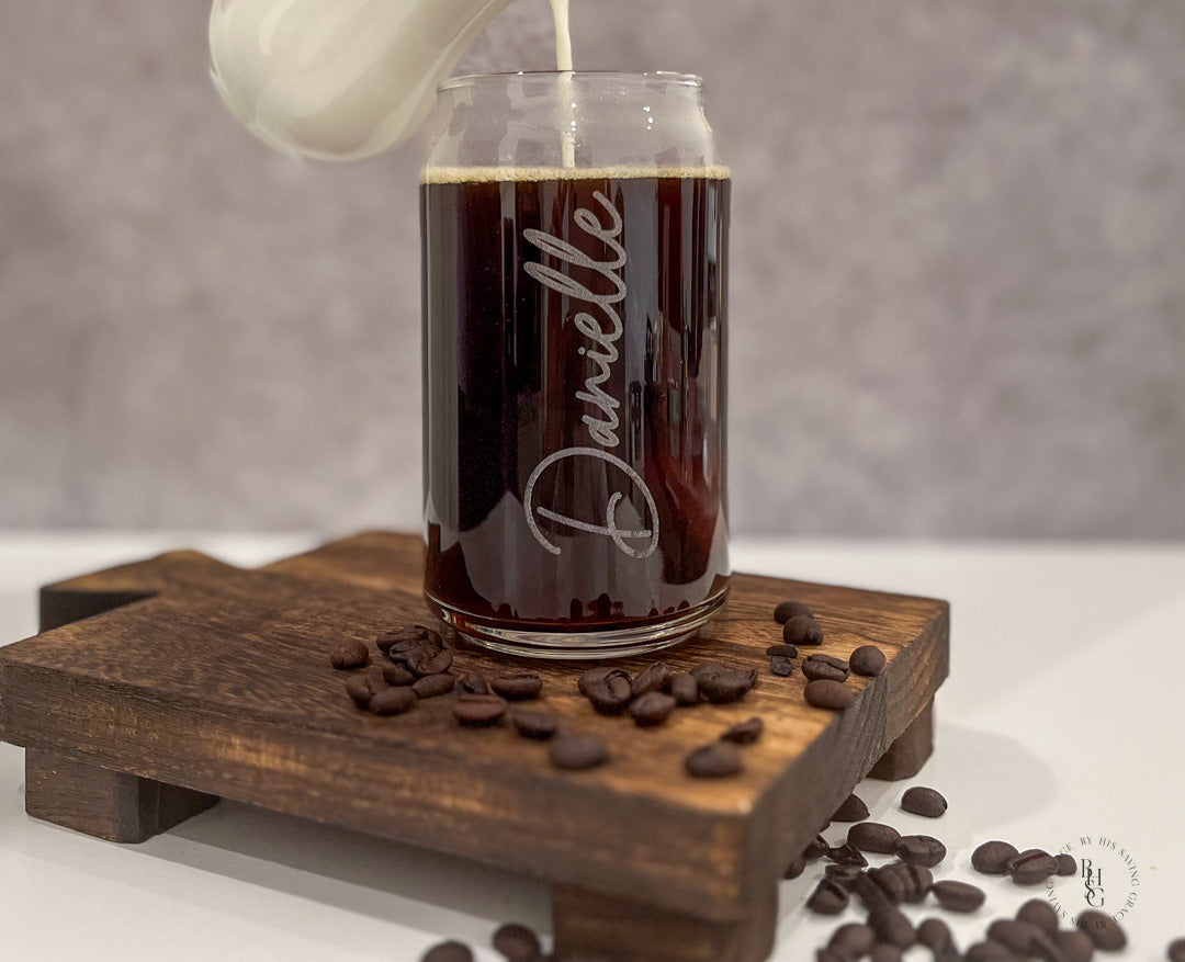 Our laser-etched can glass is personalized with your name of choice and makes for great gifts for newlyweds, bridal parties, birthdays, or a housewarming party, to name a few!