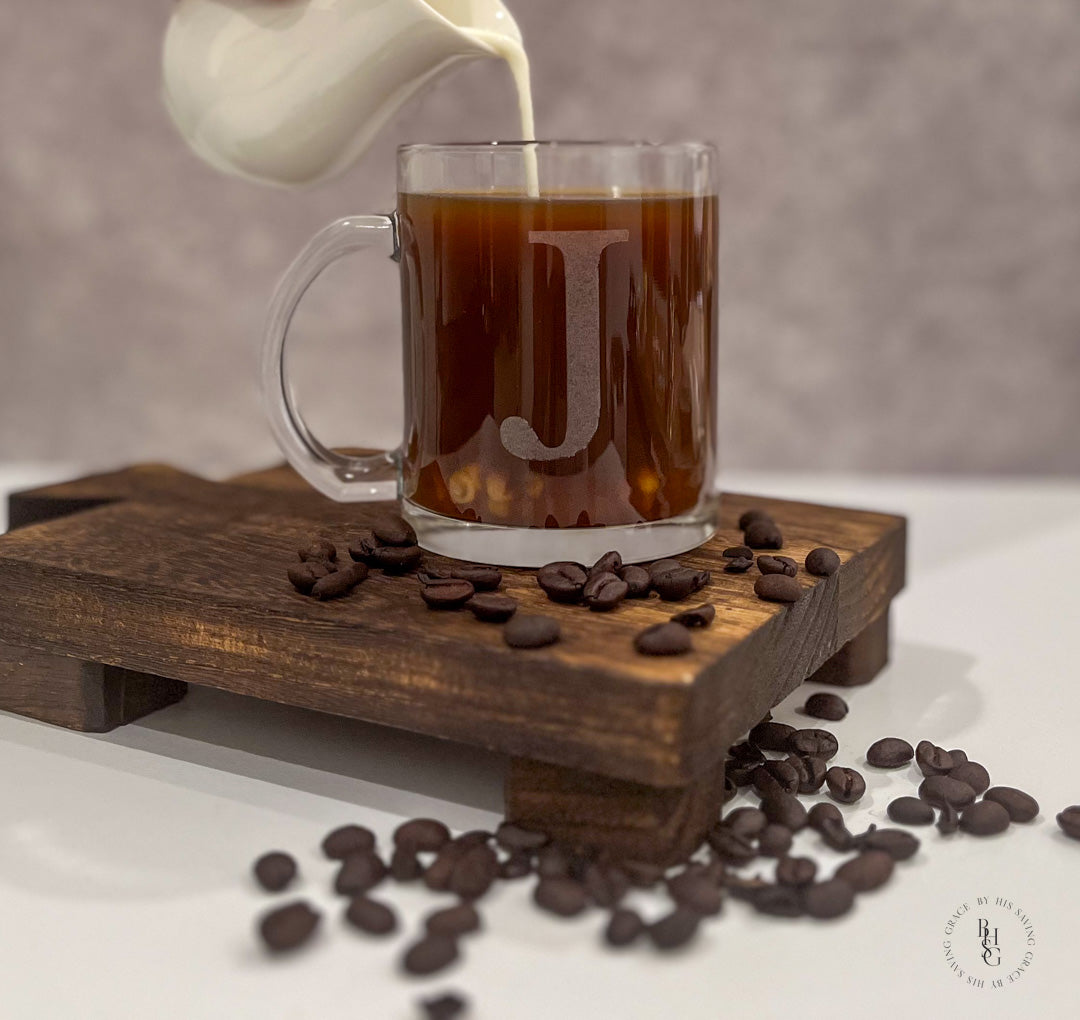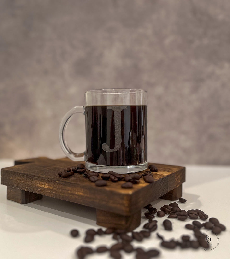 Our laser-etched glass coffee cup is personalized with your initial of choice and makes for great gifts for newlyweds, bridal parties, birthdays, or a housewarming party, to name a few!