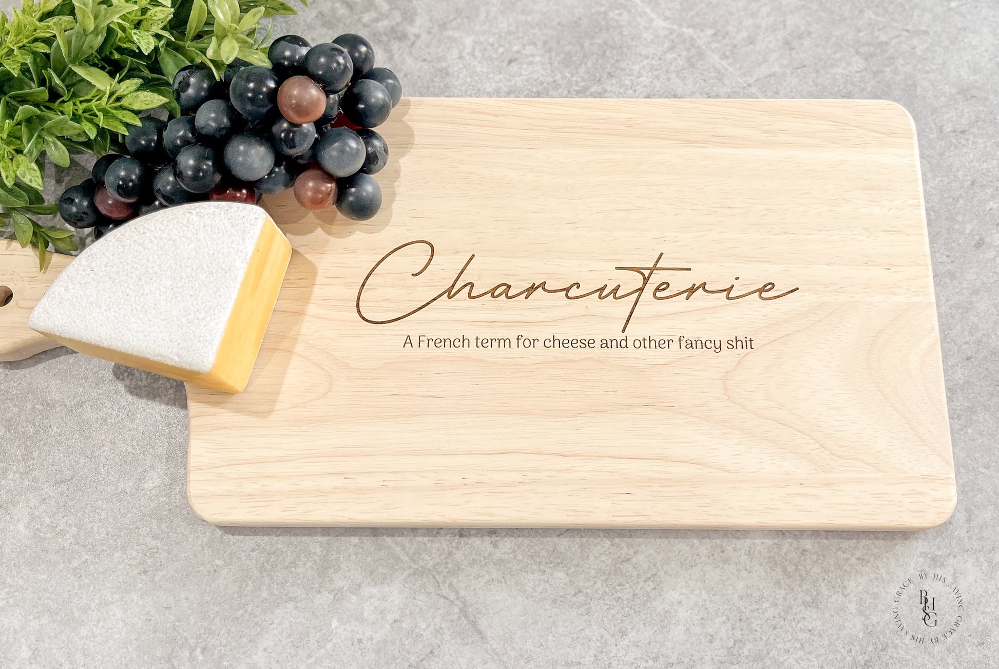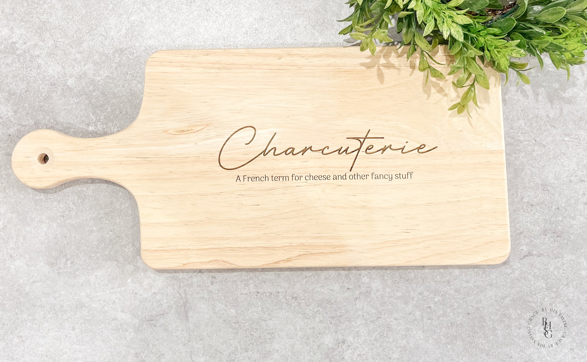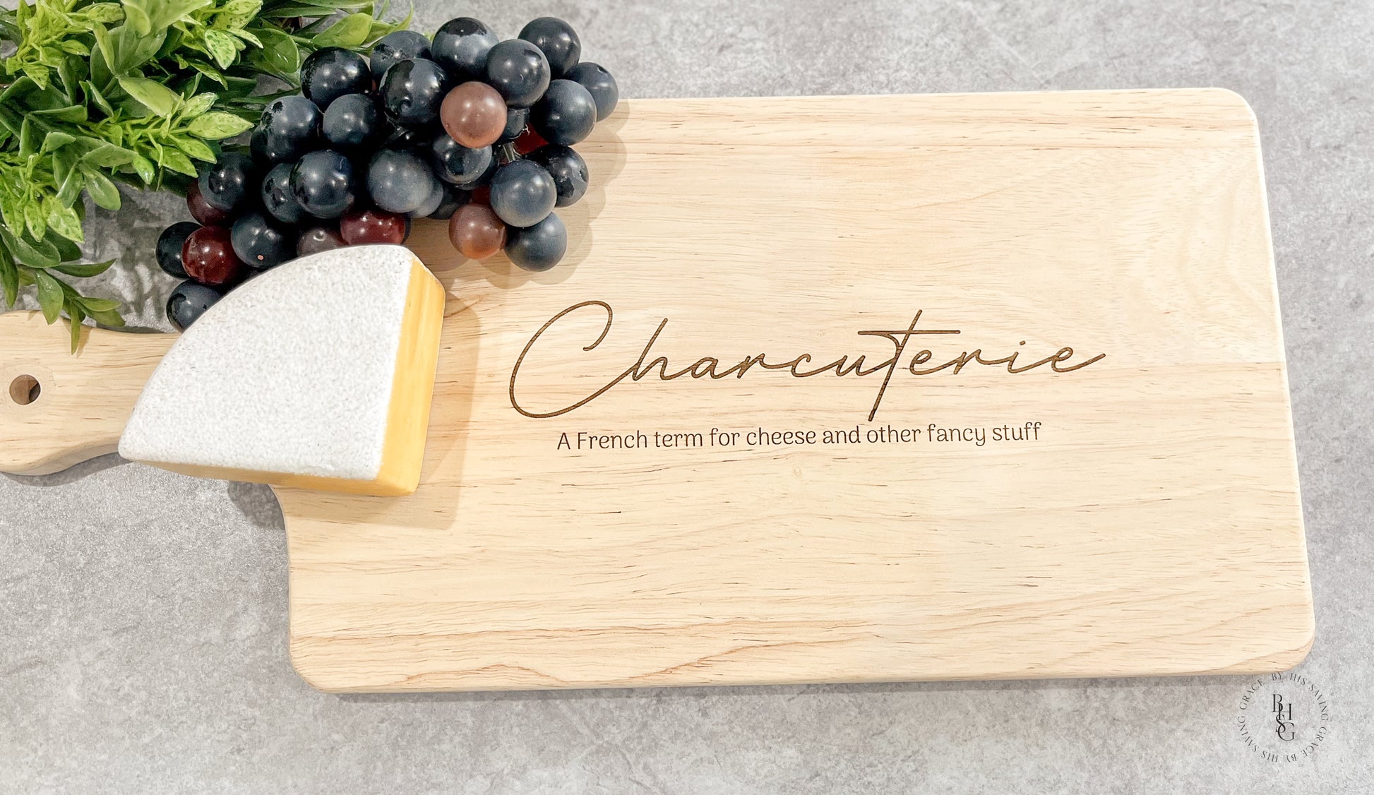 Our laser-engraved wooden serving board is engraved with the phrase shown. This board can be used to serve cheese, hors d'oeuvres, appetizers, and desserts. This custom serving board is a perfect gift for a housewarming gift, client gift, or wedding gift, to name a few.