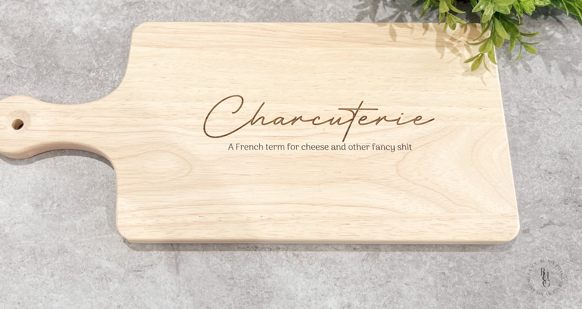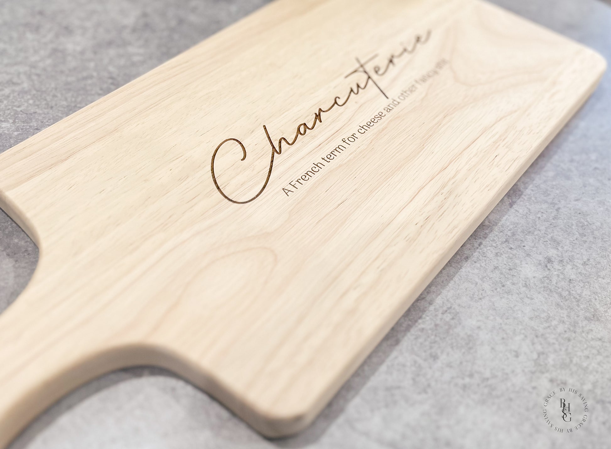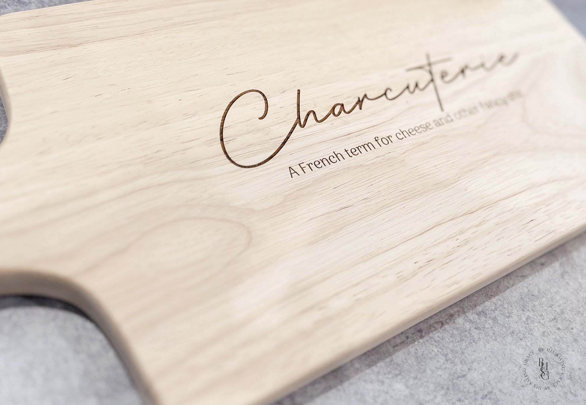 Our laser-engraved wooden serving board is engraved with the phrase shown. This board can be used to serve cheese, hors d'oeuvres, appetizers, and desserts. This custom serving board is a perfect gift for a housewarming gift, client gift, or wedding gift, to name a few.