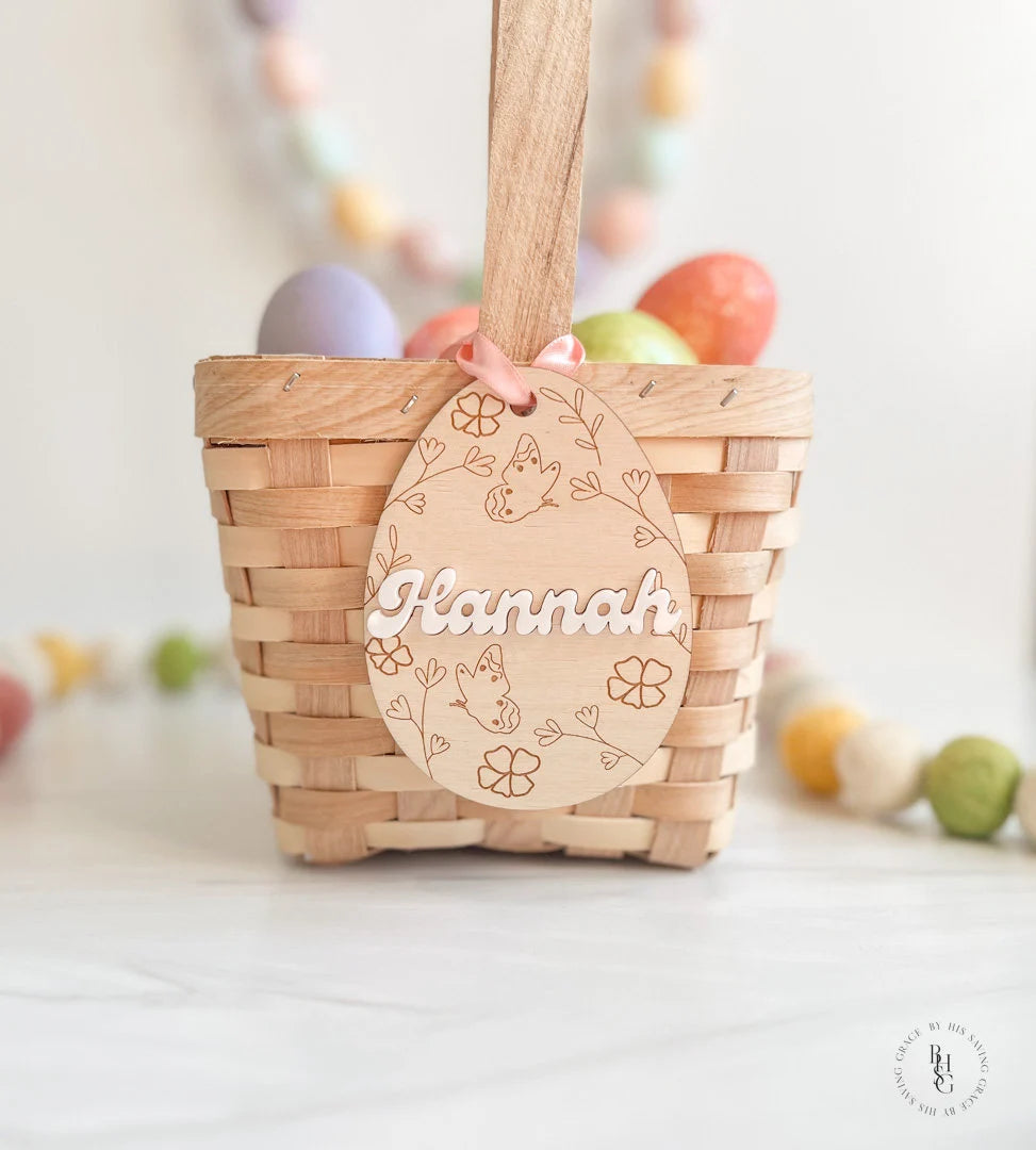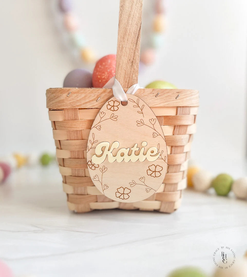 Our laser-cut Floral Easter tag is made from high-quality wood + acrylic, and is personalized with a 3D acrylic name of your choice. Add this tag to an Easter basket and you have a piece that will last for years to come!