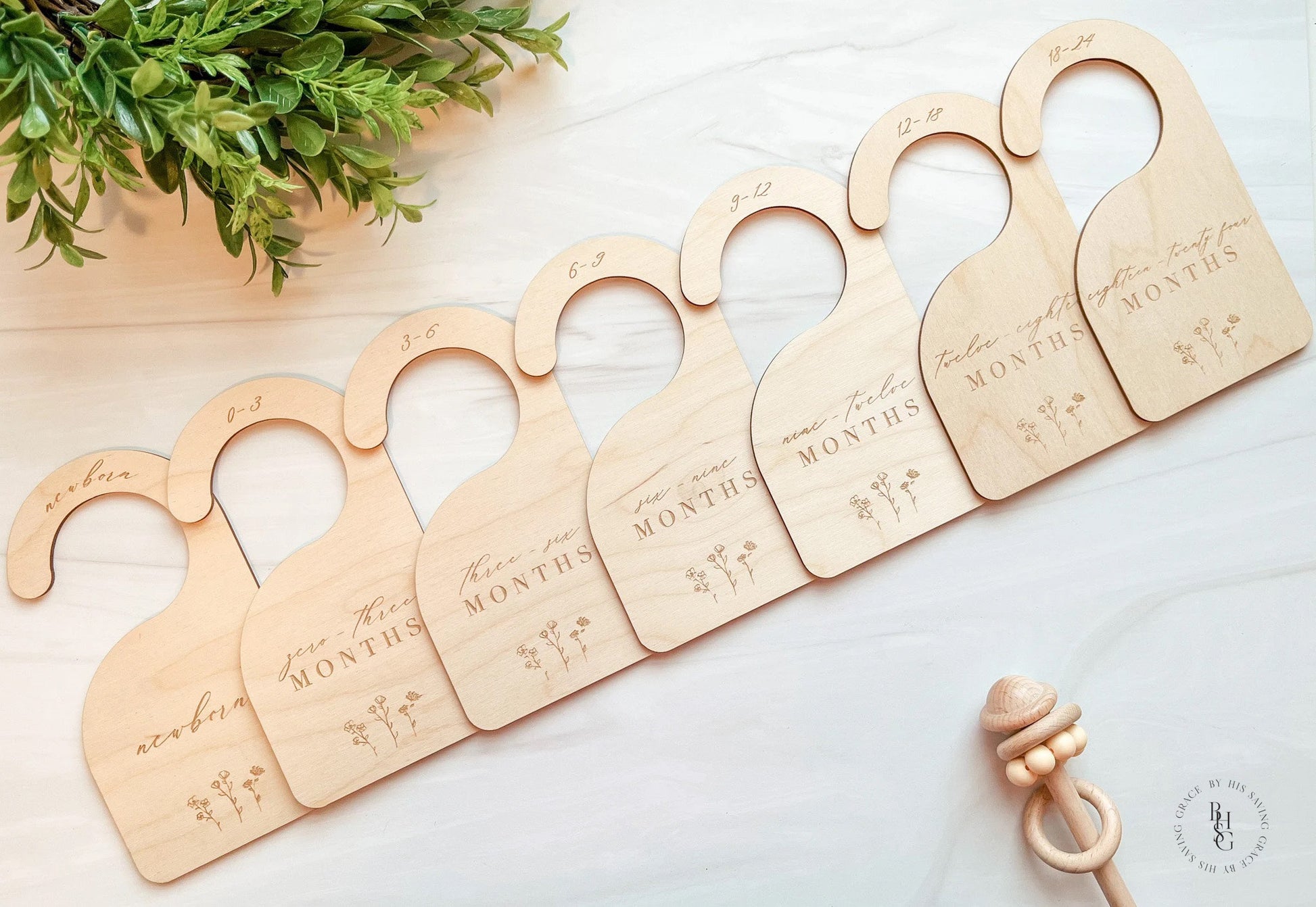 Our laser-cut and engraved classic flower closet dividers are a great and adorable way to organize the clothes in your baby's closet. This set includes Newborn, 0-3 Months, 3-6 Months, 6-9 Months, 9-12 Months, 12-18 Months, and 18-24 Months. The dividers are single-sided.