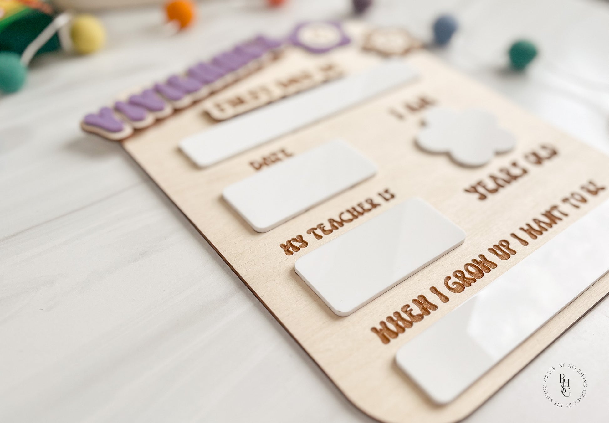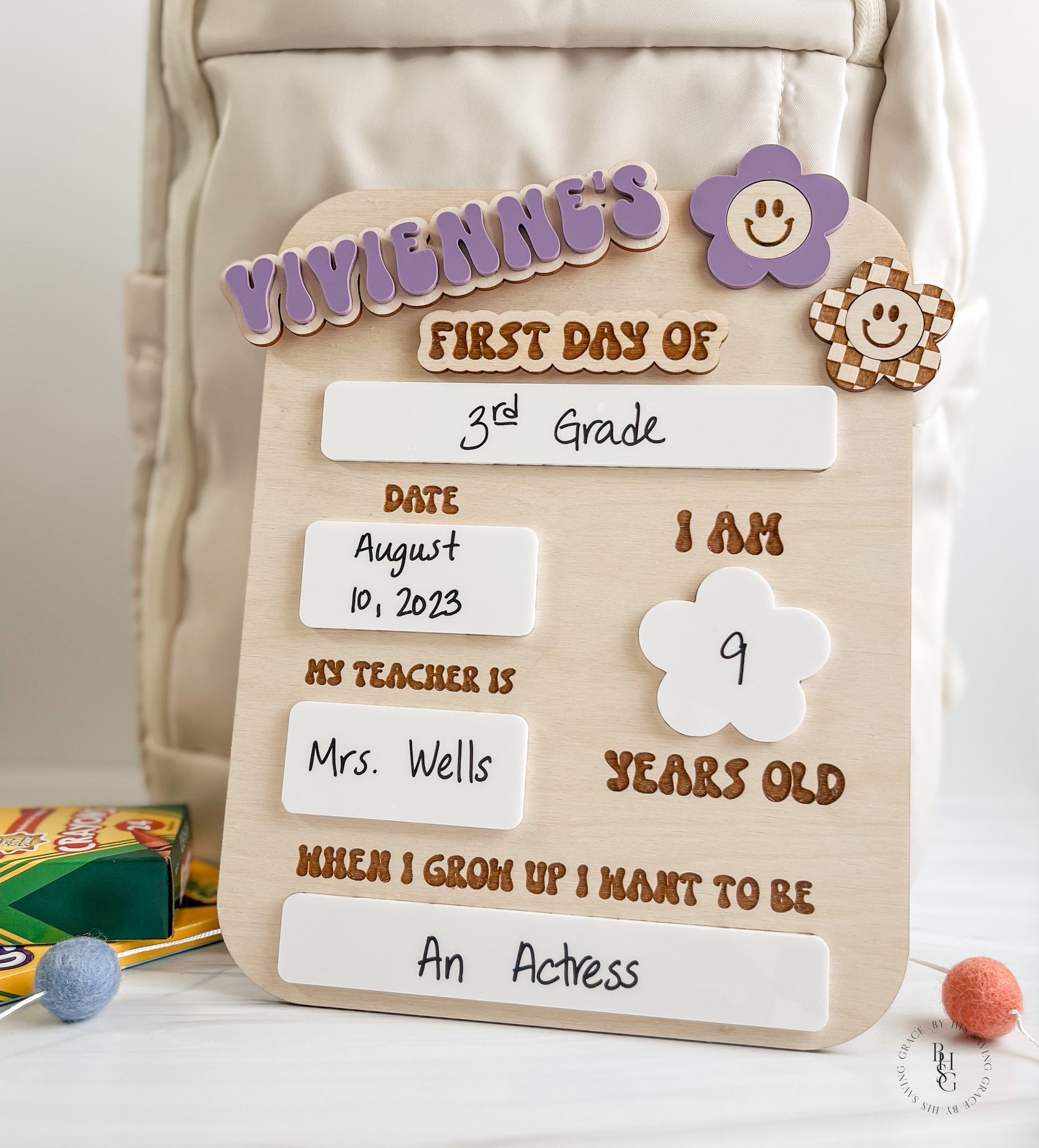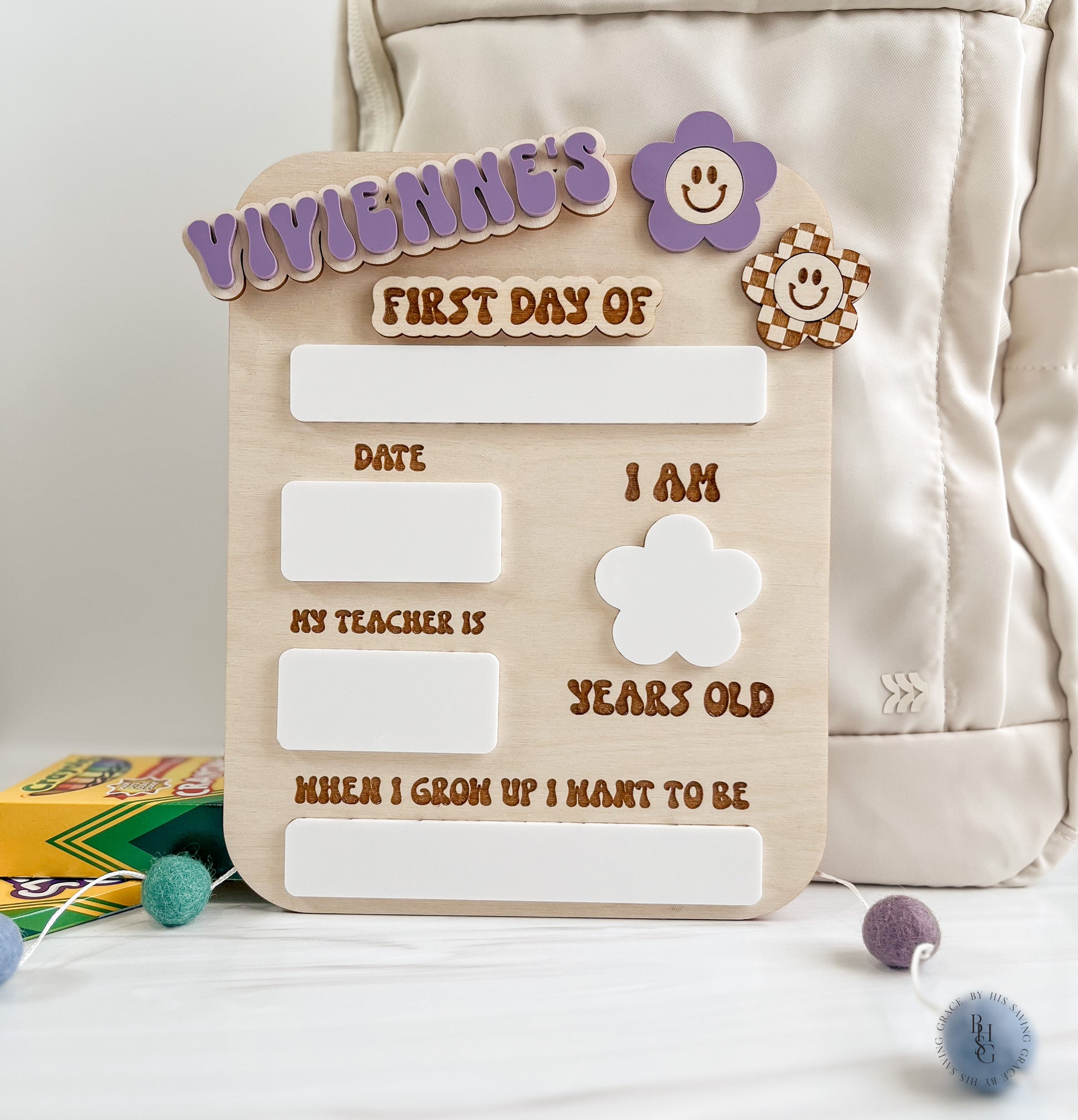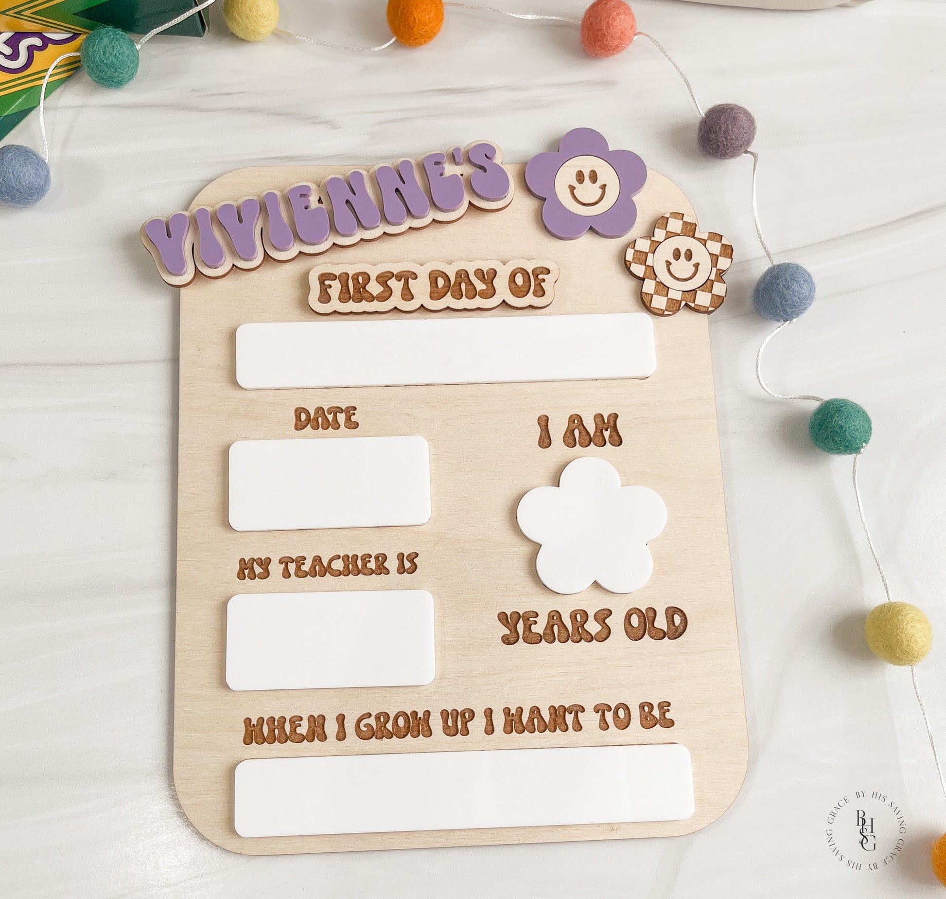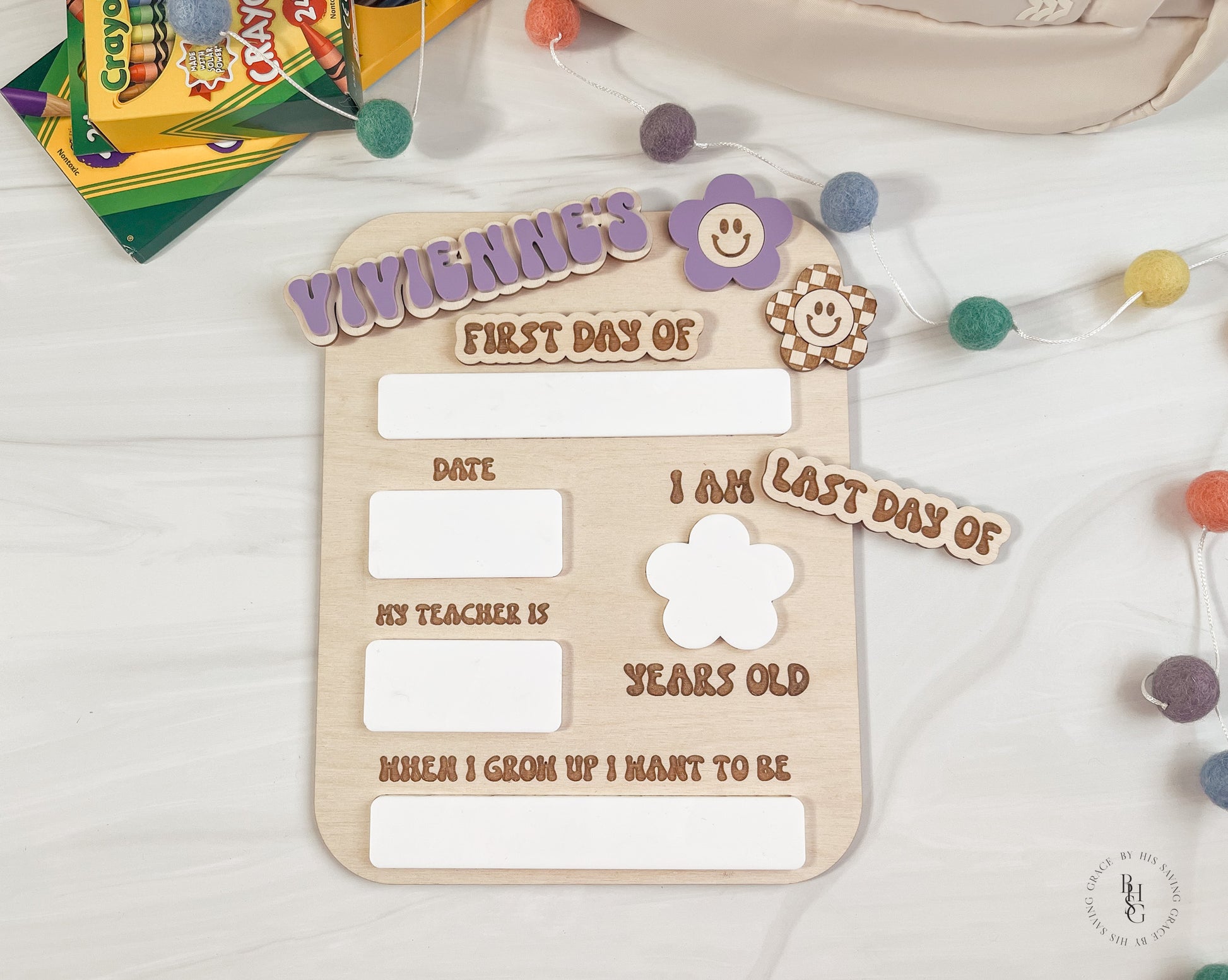 Our laser-cut and engraved groovy interchangeable first and last day of school sign is the perfect prop to help capture those first and last day of school pictures. It features acrylic that doubles as a dry-erase board. Write on the acrylic using Expo markers and wipe off the acrylic with a damp cloth or dry-erase board cleaner when ready! The name(s) and first day of and last day of are attached with Velcro, making them easy to switch out.
