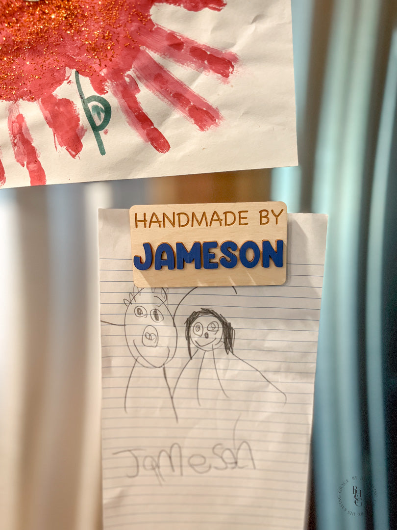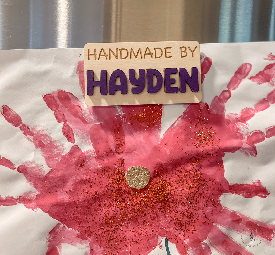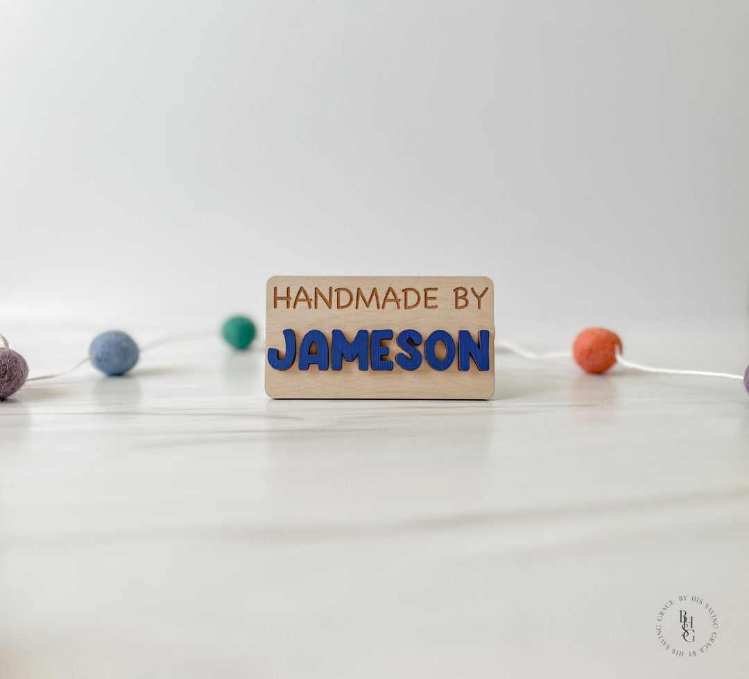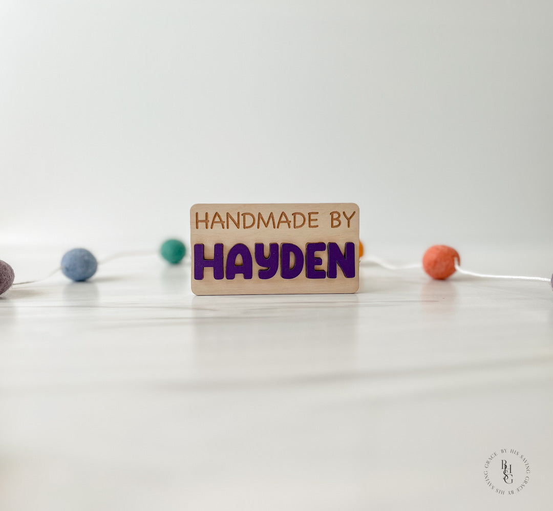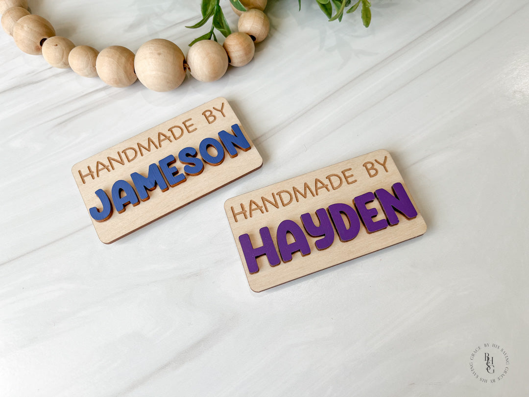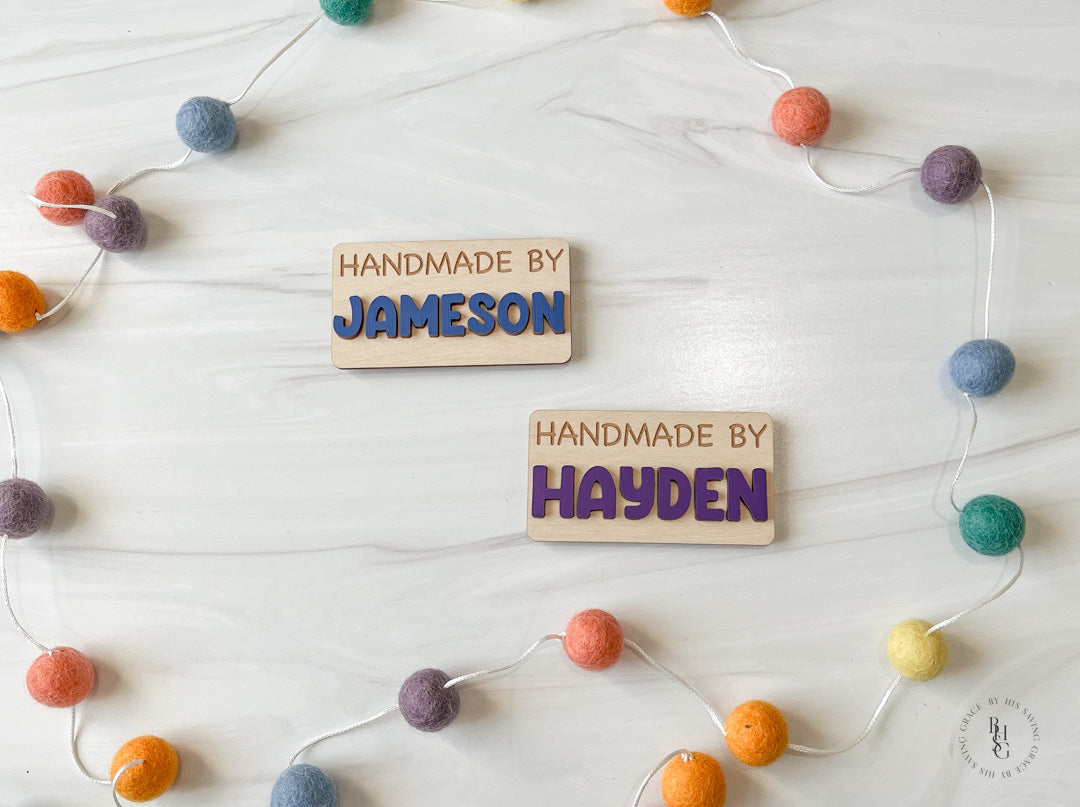 Our laser-cut and engraved "Handmade By "Your Name" Magnet is personalized with your name of choice and features 3D wooden letters for the name. This adorable magnet perfectly displays your kiddo's artwork on the fridge or any magnetic surface.