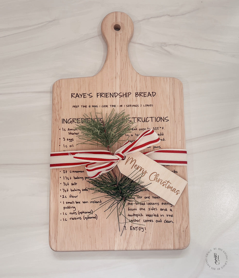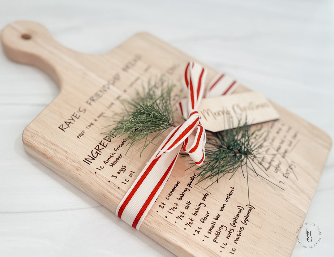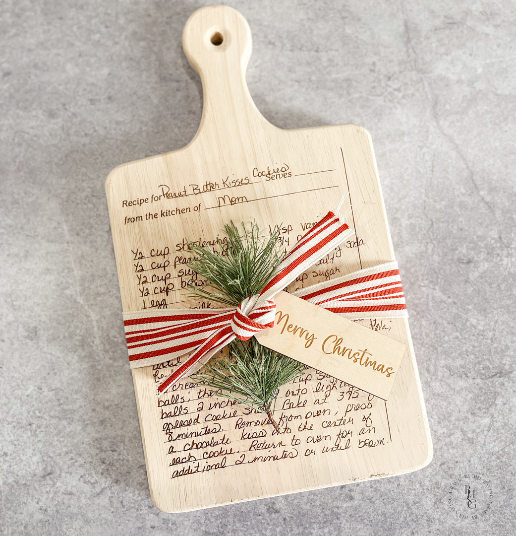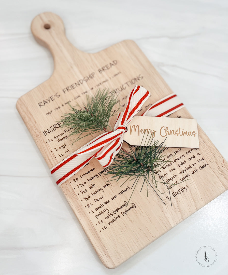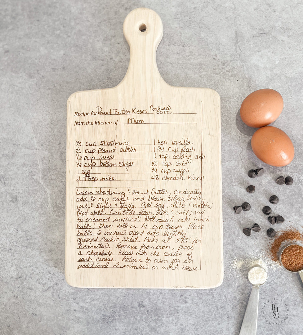 Our laser-engraved, beautiful, and unique handwritten recipe serving boards make a truly precious gift for Mom, Grandma, or anyone you'd love to share a special family recipe with. This will surely be a gift they will always treasure. The recipe can be emailed to info@byhissavinggrace.com.