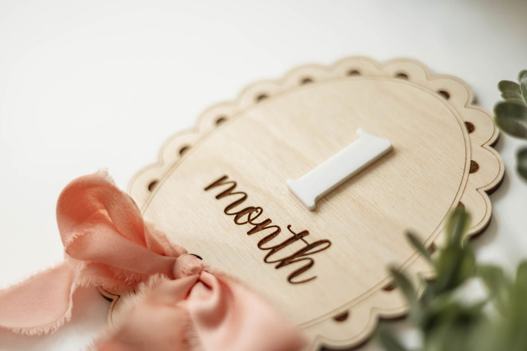 Interchangeable Wooden Scalloped Oval Monthly Milestone Markers With Bow