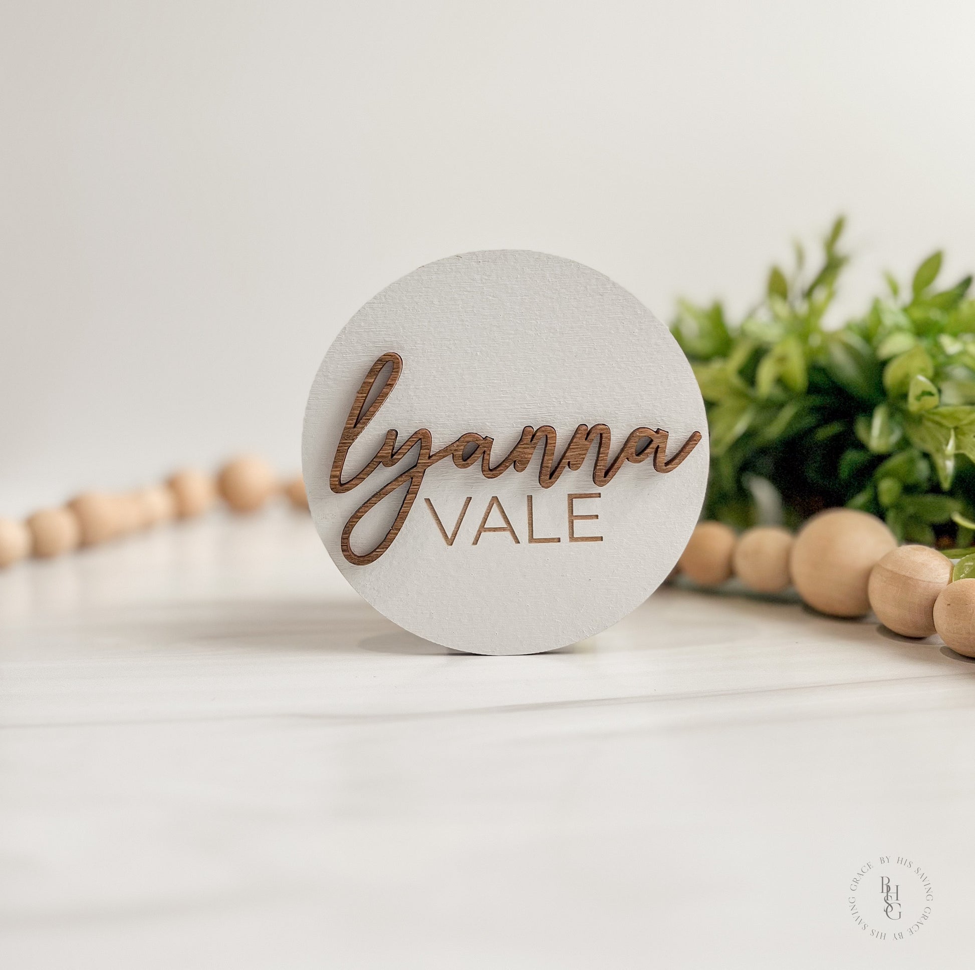 Our laser-cut and engraved baby announcement sign featuring 3D wooden letters for the first name and engraved letters for the second name. This beautiful personalized nameplate matches our best-selling 3D monthly milestones and is the perfect way to announce your little one's arrival!