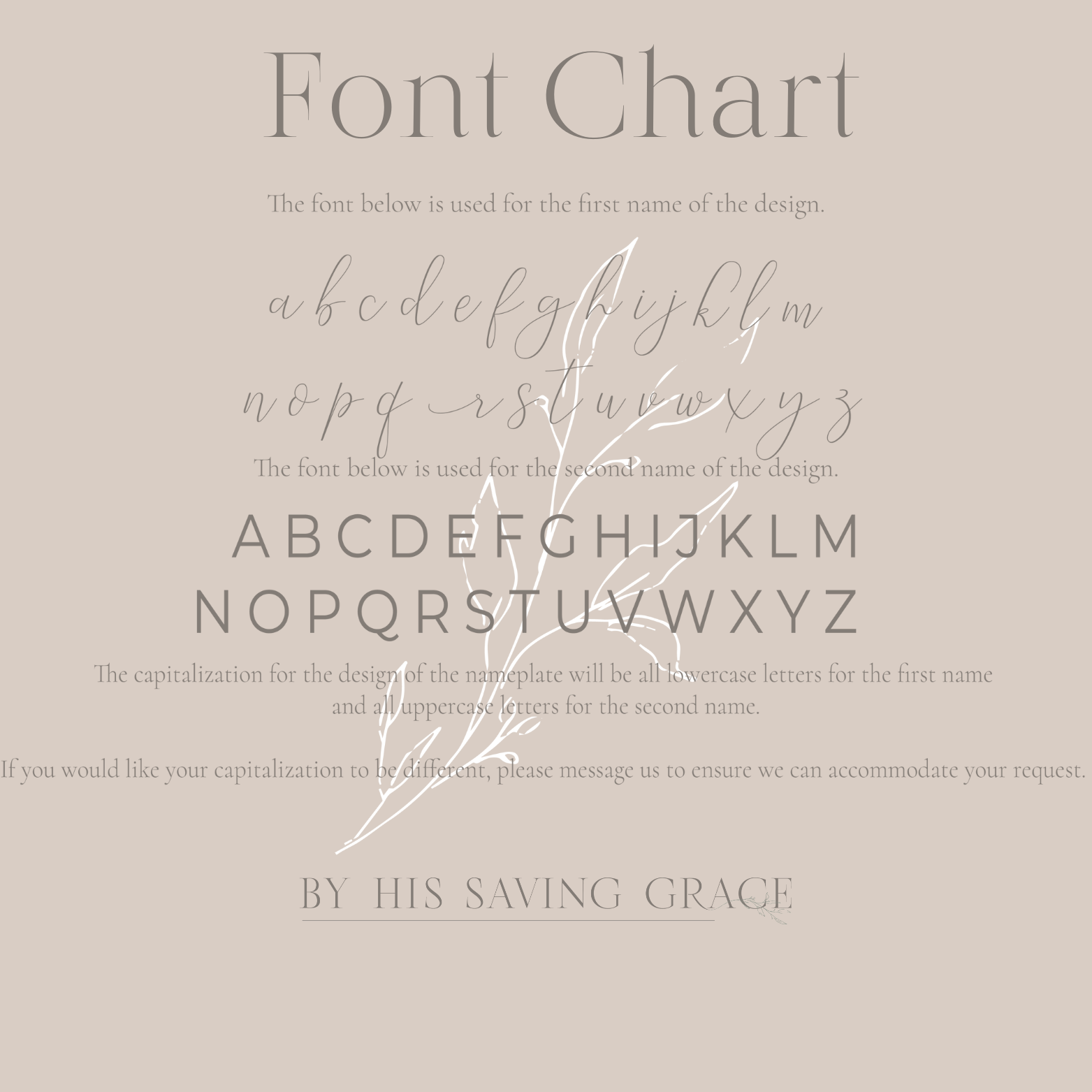 The spacing and size of the names will vary based on the characters and number of characters in the name. A digital proof of how your nameplate will look can be purchased here.