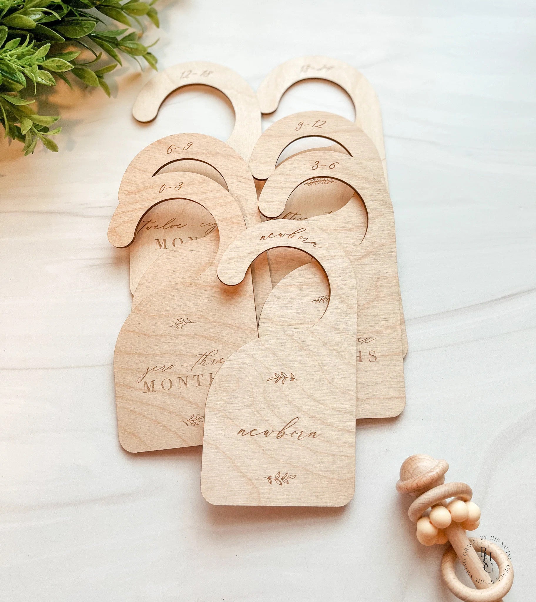 Our laser-cut and engraved minimalist floral closet dividers are a great and adorable way to organize the clothes in your baby's closet. This set includes Newborn, 0-3 Months, 3-6 Months, 6-9 Months, 9-12 Months, 12-18 Months, and 18-24 Months. The dividers are single-sided.