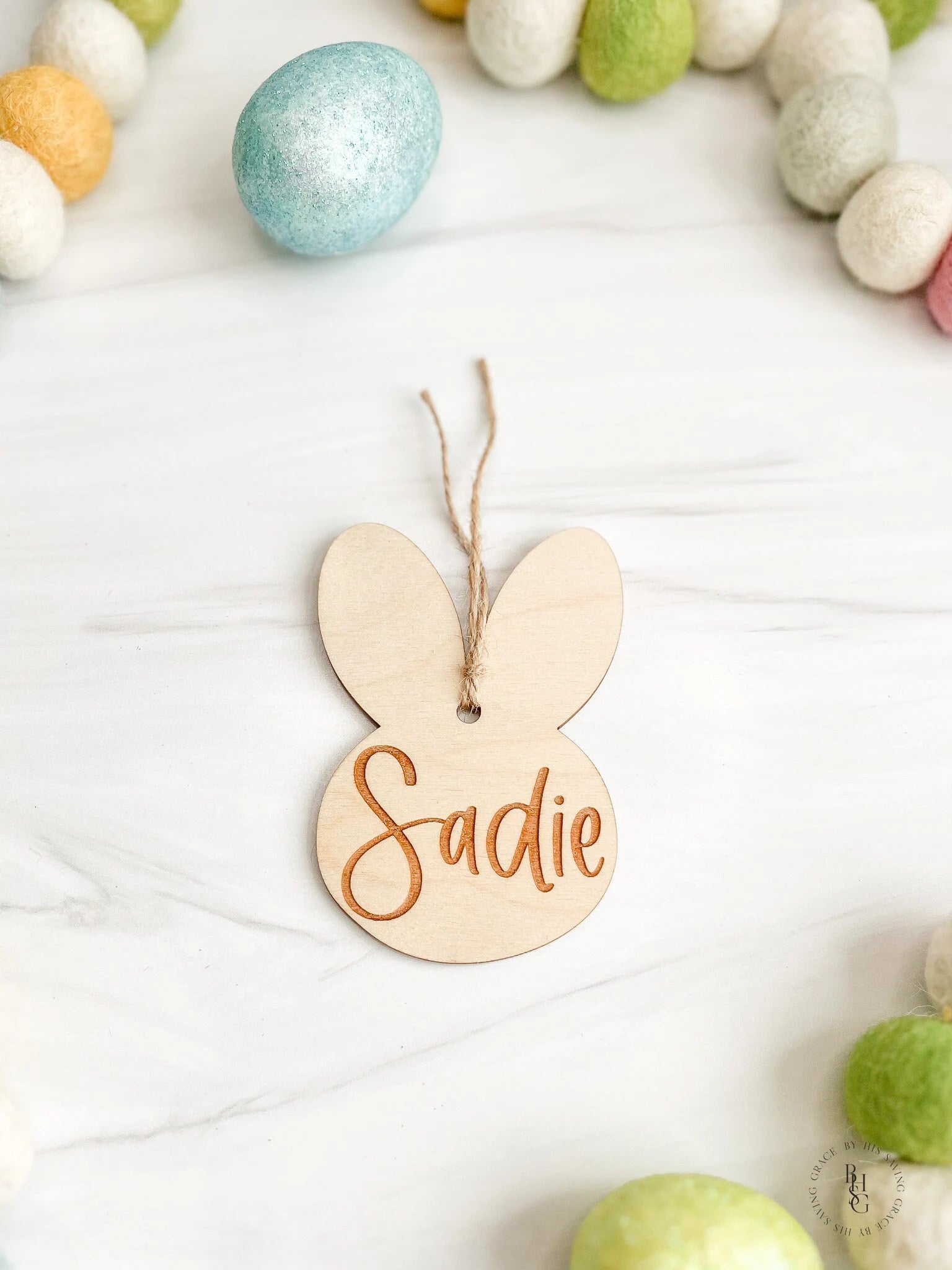 Our laser-cut Minimalist Wooden Bunny tag is made from high-quality wood, and is engraved with your name of your choice. Add this tag to an Easter basket and you have a piece that will last for years to come!
