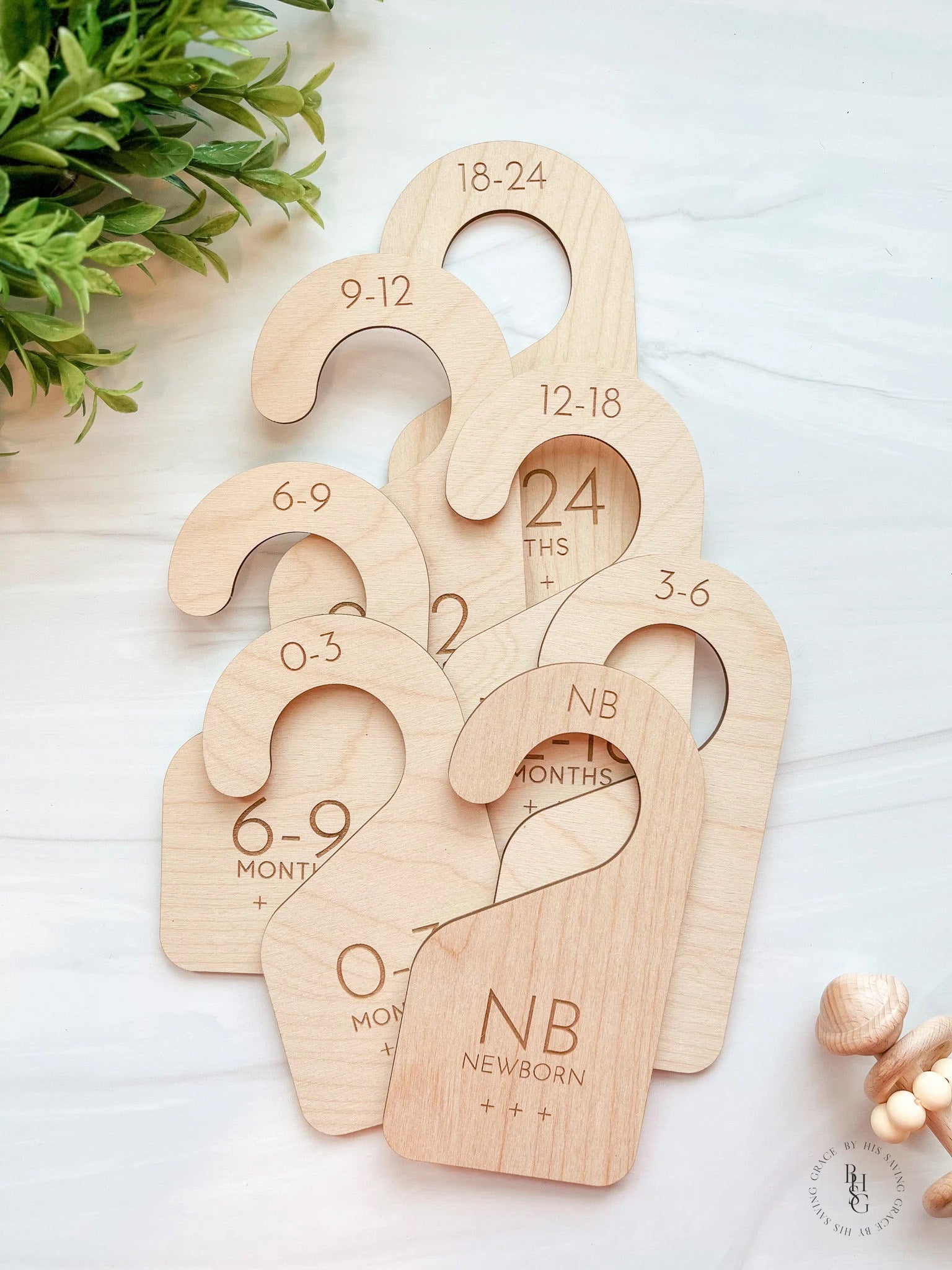 Our laser-cut and engraved modern closet dividers are a great and adorable way to organize the clothes in your baby's closet. This set includes Newborn, 0-3 Months, 3-6 Months, 6-9 Months, 9-12 Months, 12-18 Months, and 18-24 Months. The dividers are single-sided.