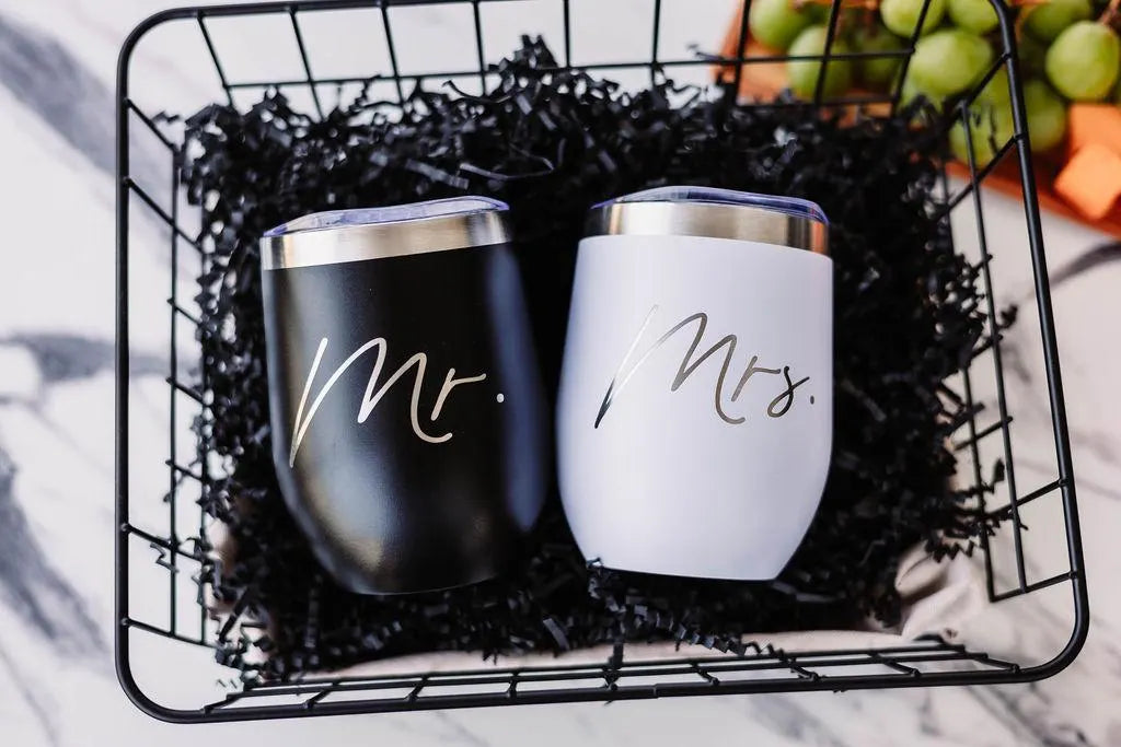 Celebrate the happy couple with this Mr. and Mrs. insulated wine tumbler set. This set includes two tumblers: one black tumbler engraved with "Mr." and one white tumbler engraved with "Mrs."