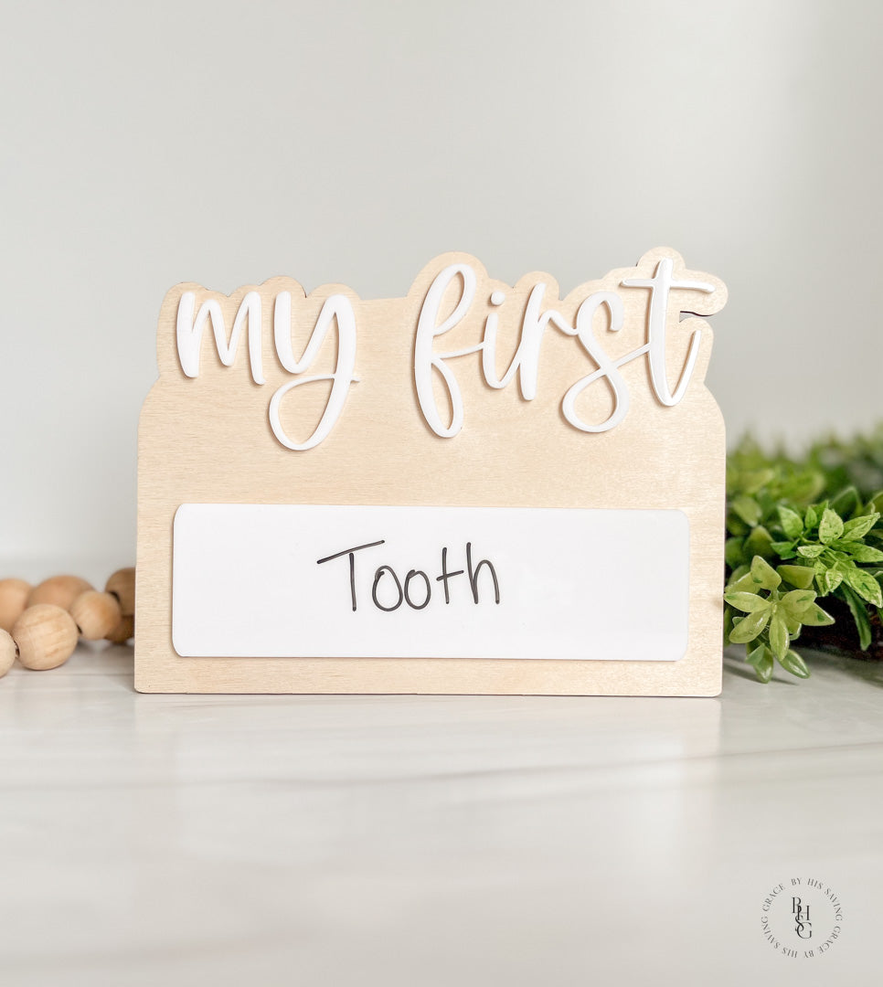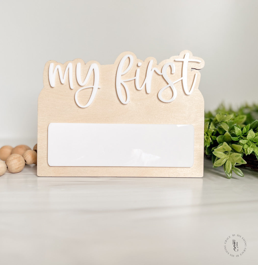 Our laser-cut "my first" dry erase sign is universal and can be used to document all your child's first. From their first tooth to their first day of school, this sign covers them all. The sign features acrylic that doubles as a dry-erase board. Write on the acrylic using Expo markers and wipe off the acrylic with a damp cloth or dry-erase board cleaner when ready!
