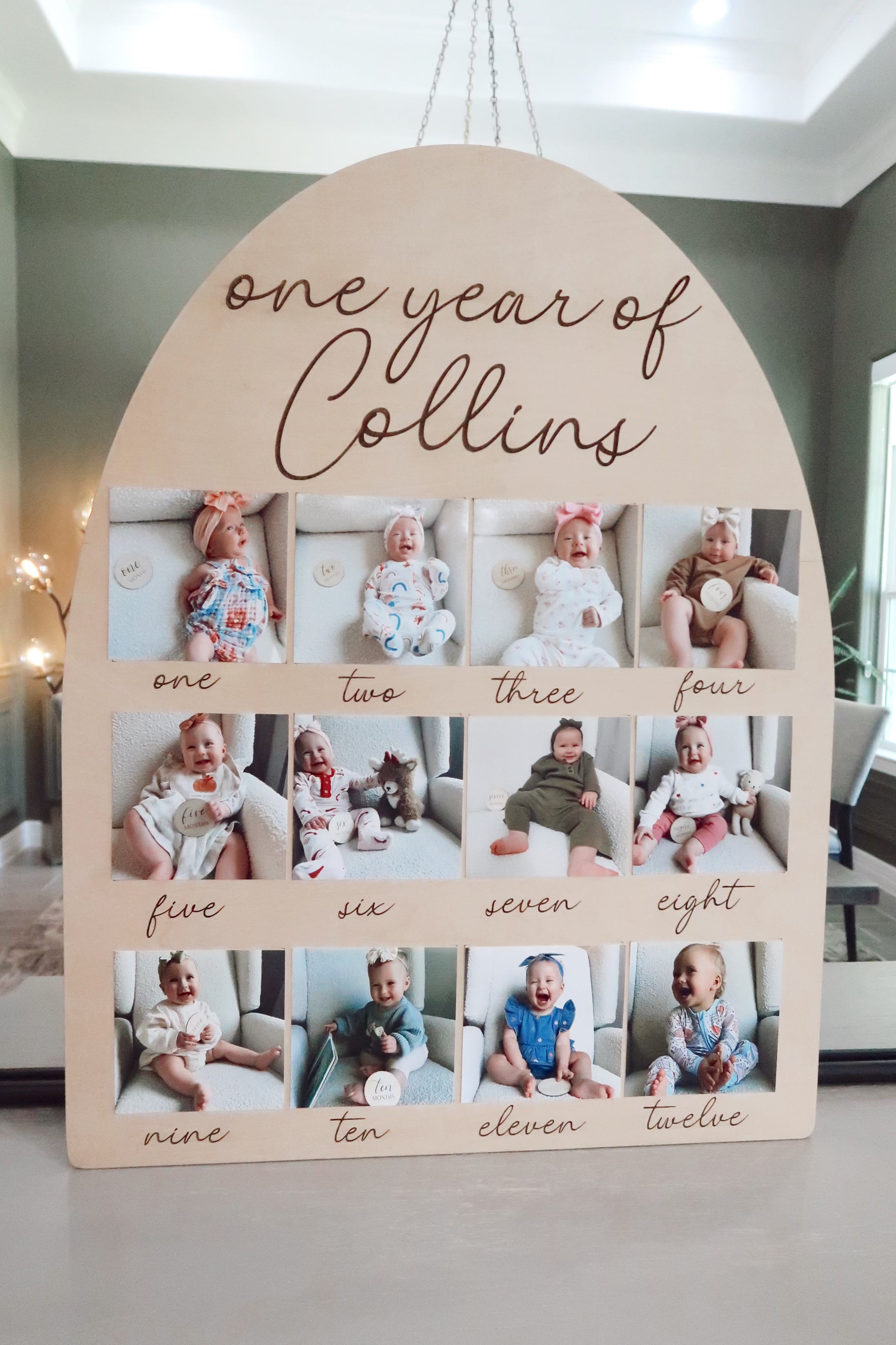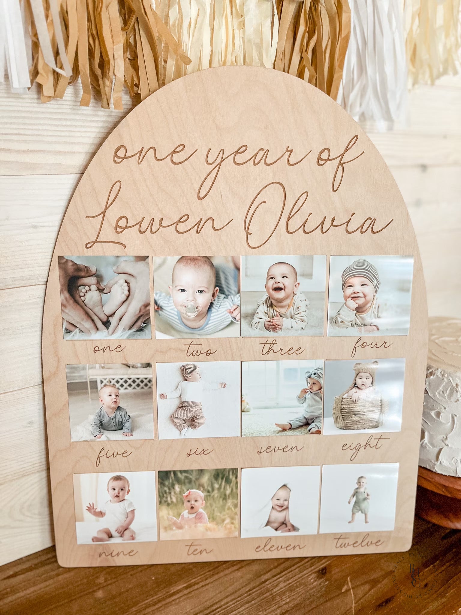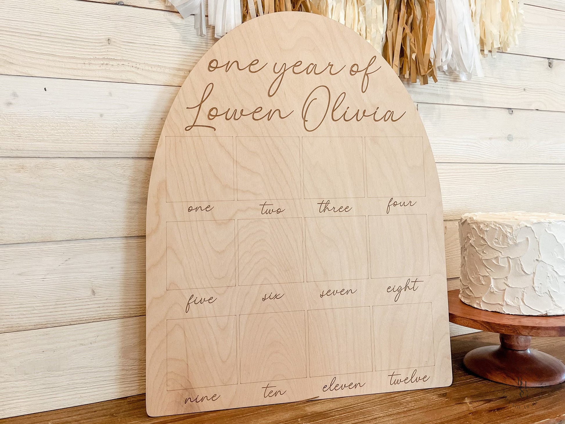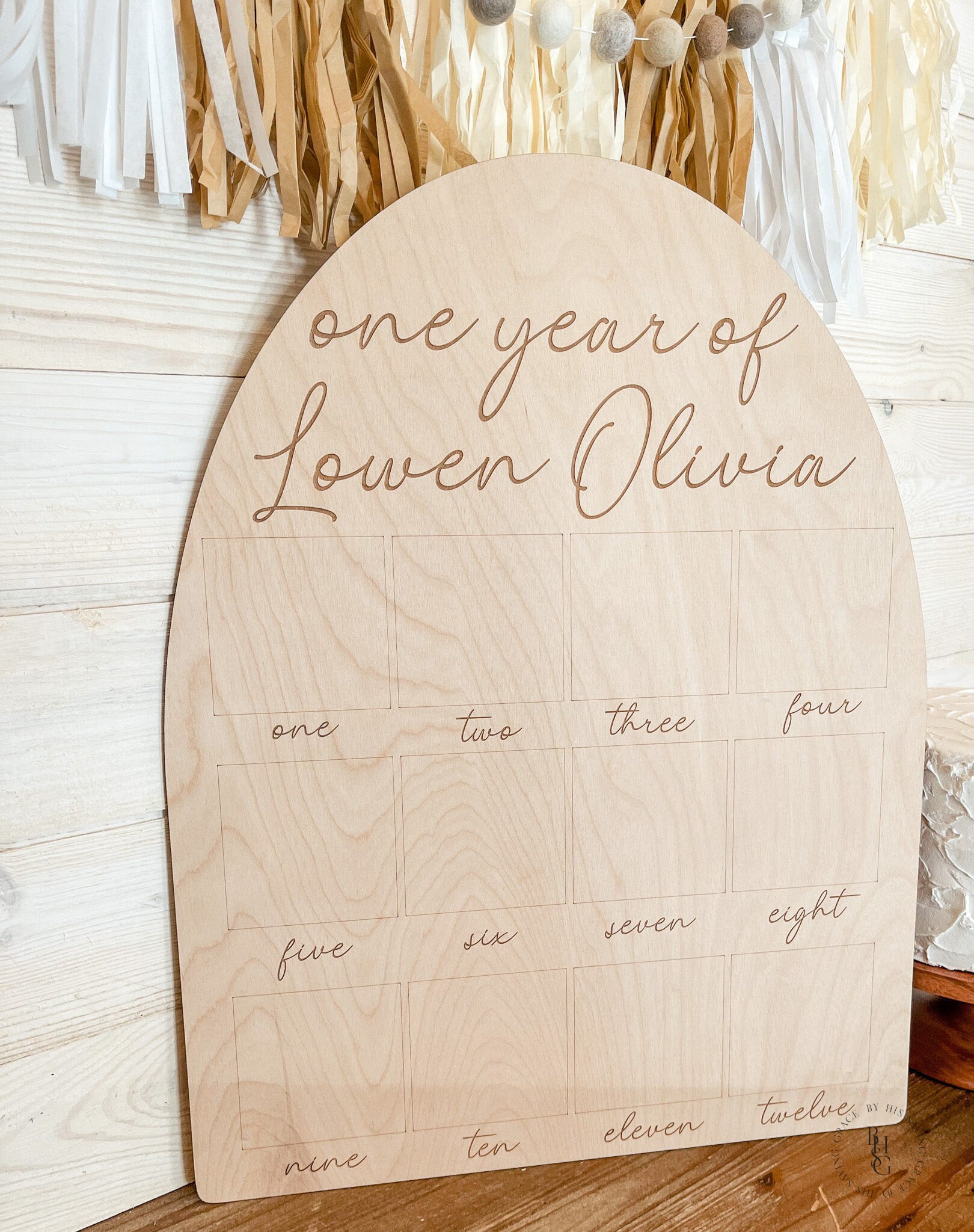 Our laser-cut and engraved "One Year Of" birthday board is personalized with your name of choice and is the perfect way to display your little one's first year at their first birthday party!