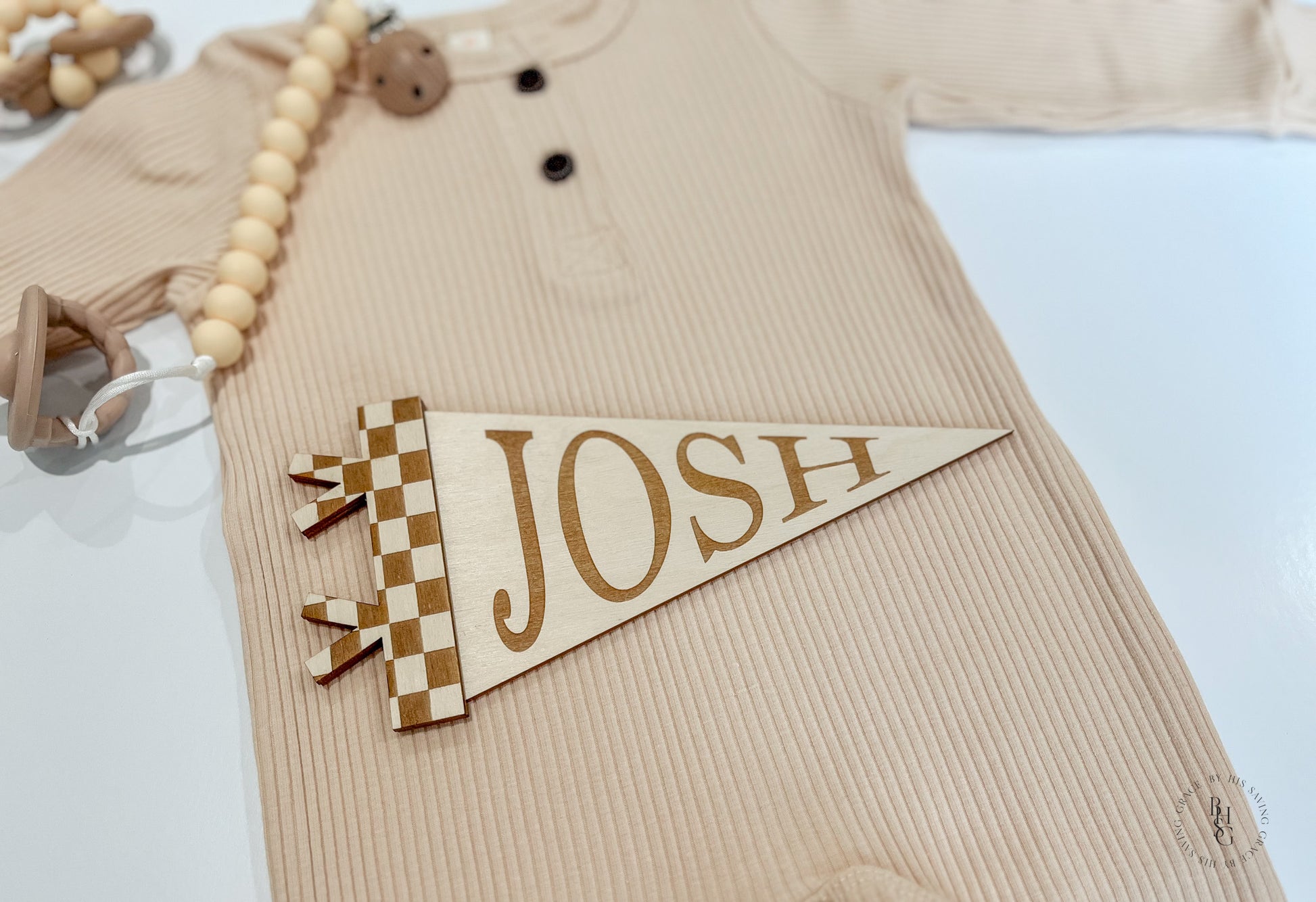 Our laser-cut and engraved checkered pennant sign is personalized with your name of choice. This sign is a perfect way to announce the arrival of your precious baby and fits perfectly in a hospital crib next to your little one.