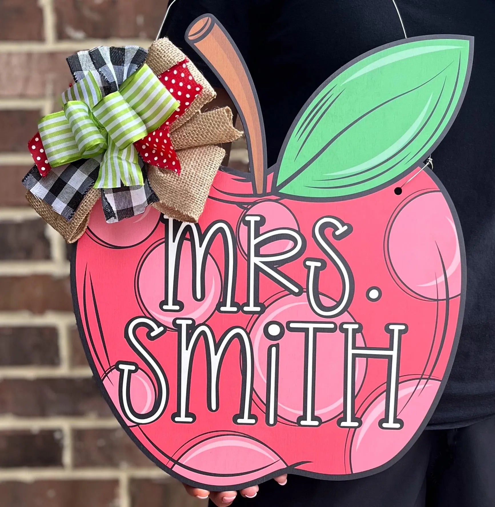 Welcome students and add a touch of personalized charm to any classroom with our adorable apple door hanger! Each door hanger is customized with your name of choice.