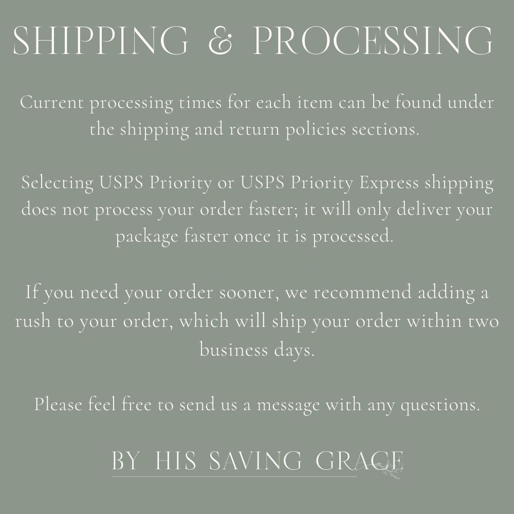 Processing time is 3-5 business days. Business days are Monday-Friday and exclude holidays. Processing times are how long it will take for your order to be made.