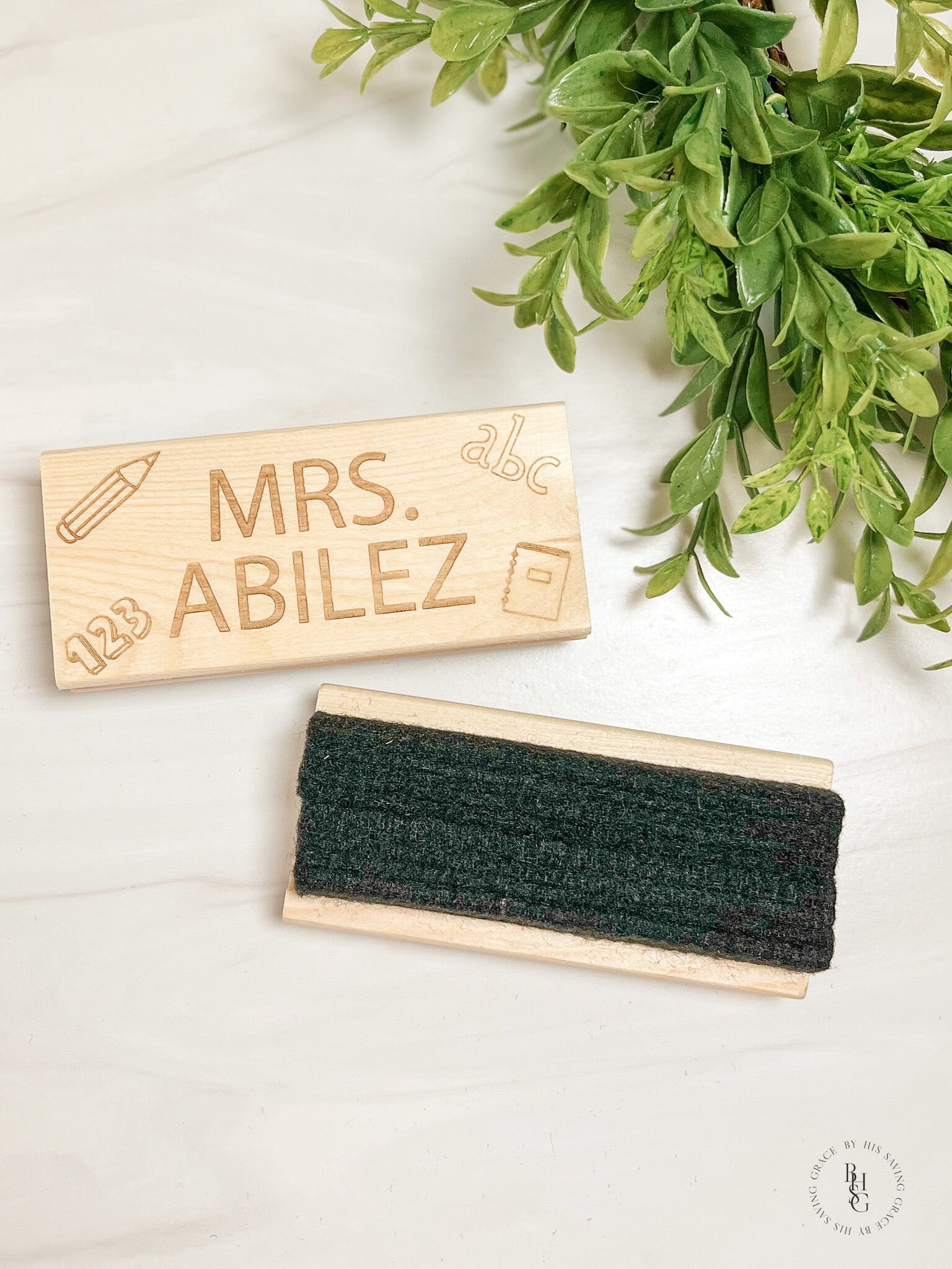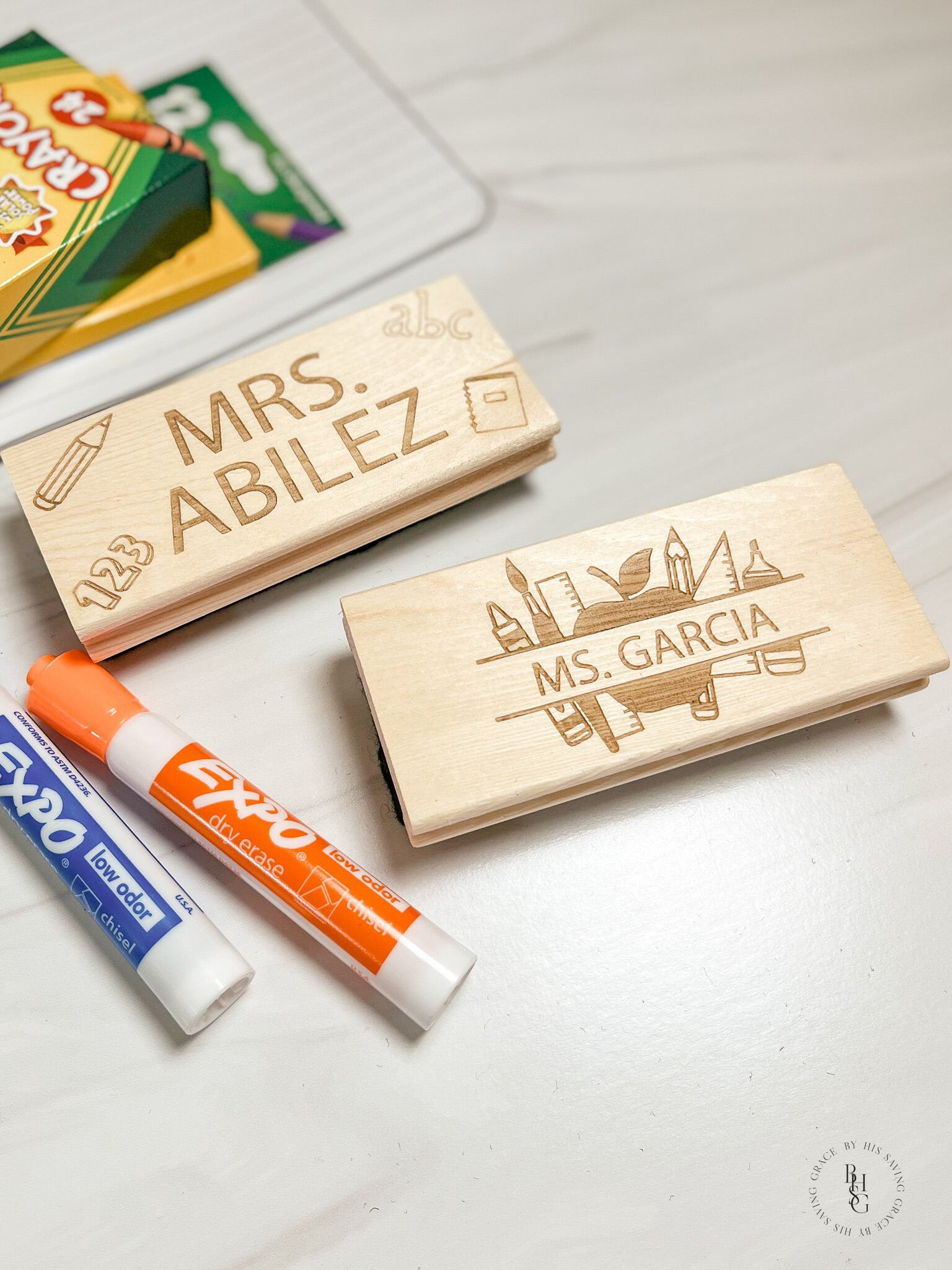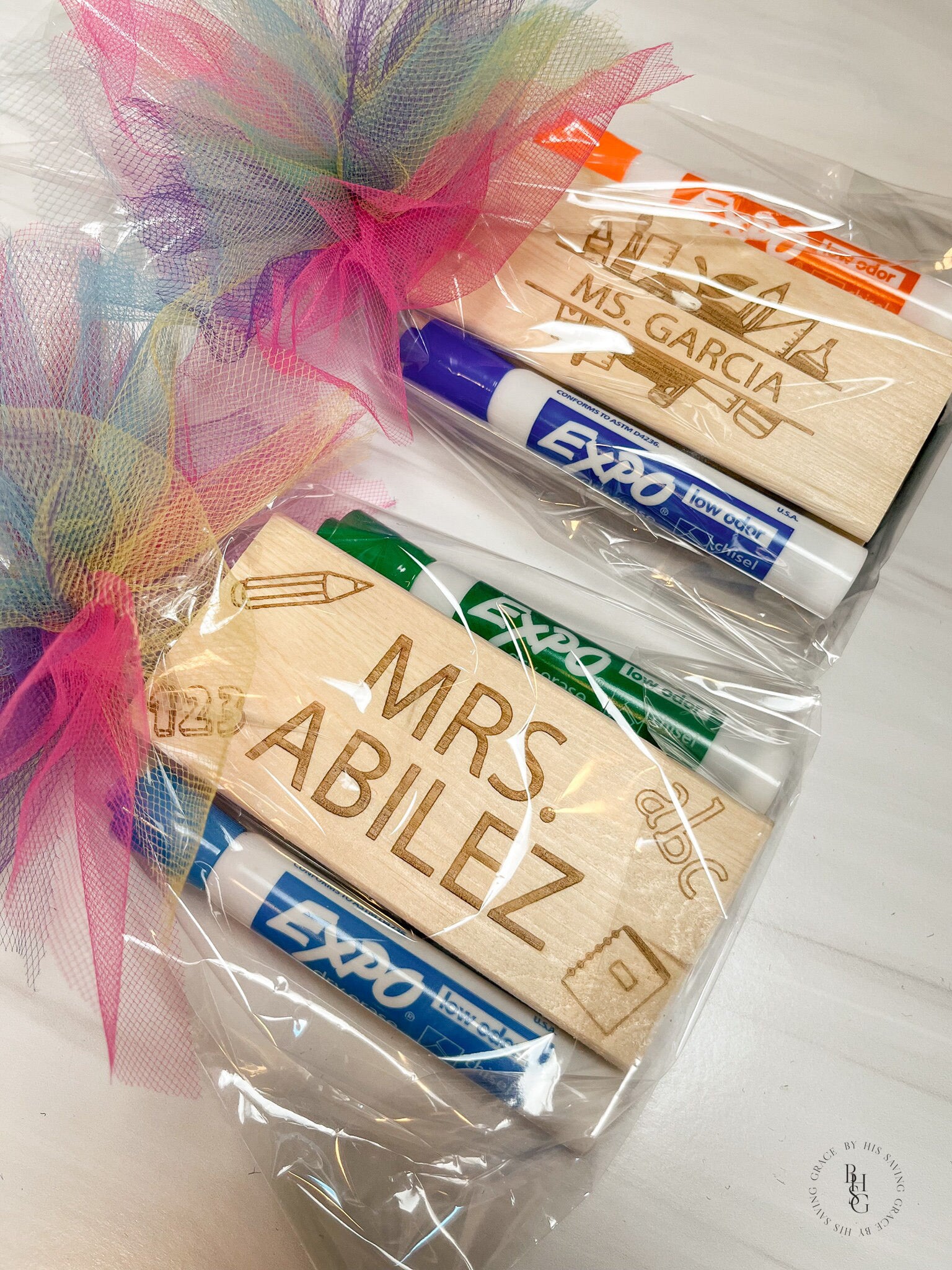 Our laser-engraved personalized wooden felt eraser is personalized with your name of choice and finished off with a tulle bow. The eraser will be packaged in a cellophane bag with (2) expo makers; colors will be chosen at random.