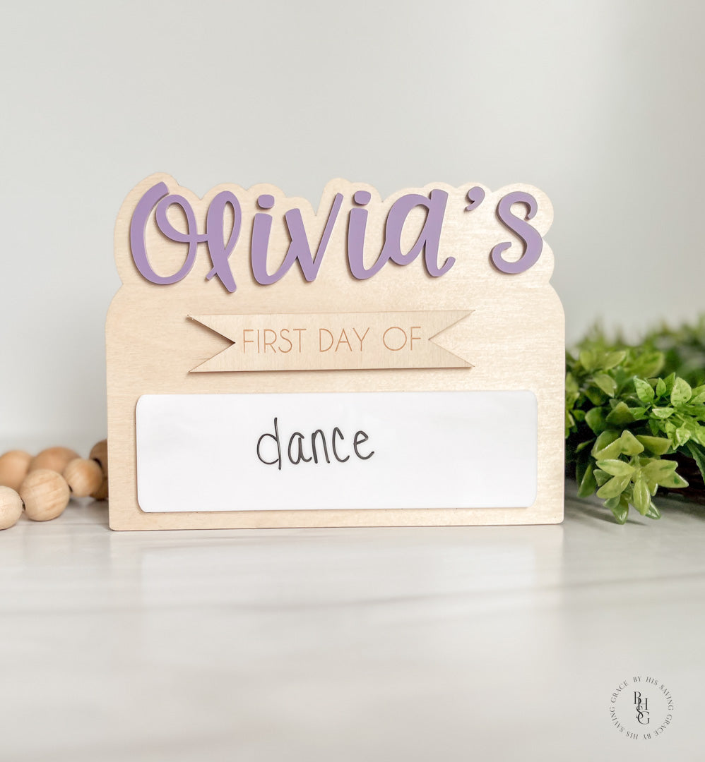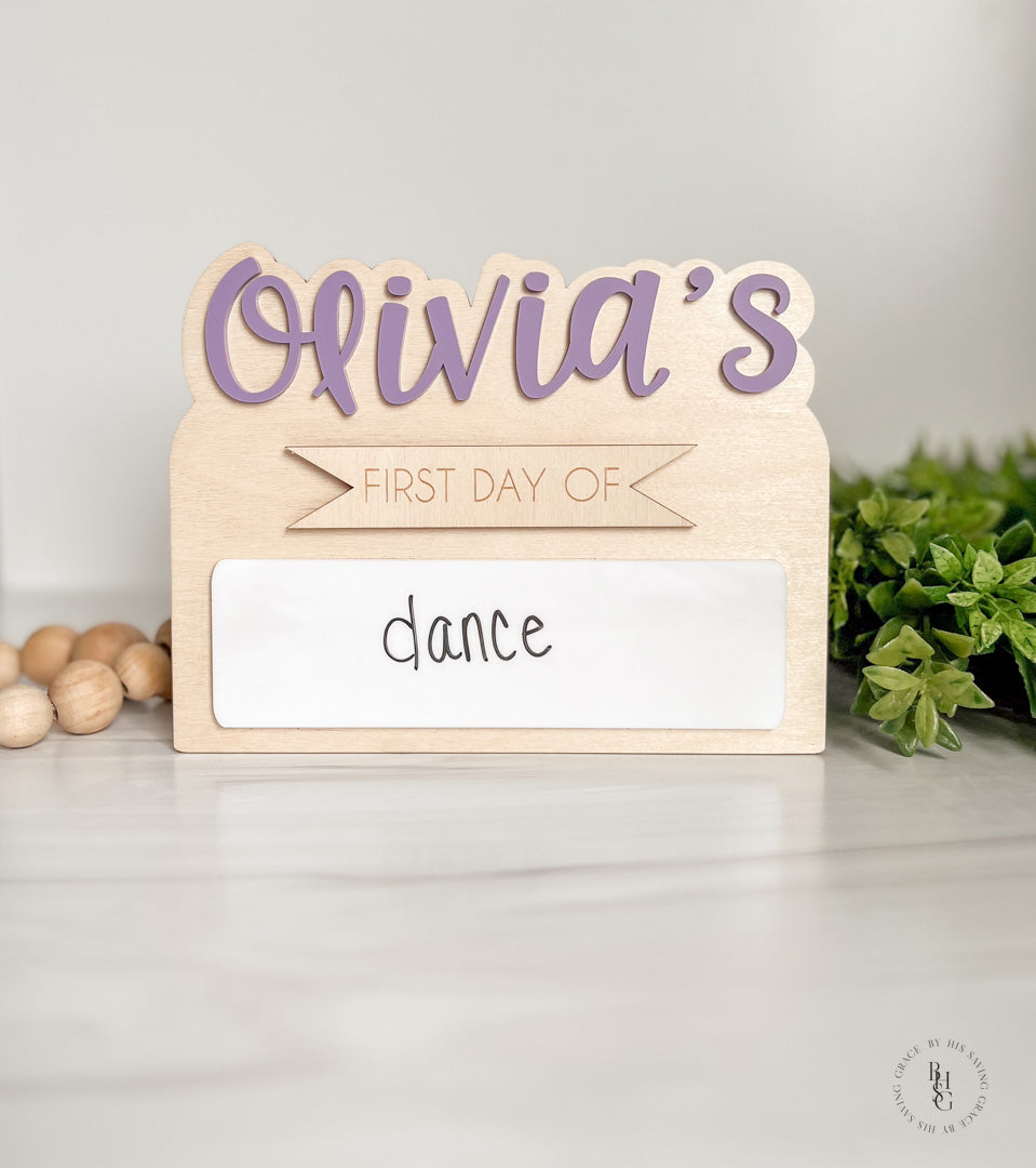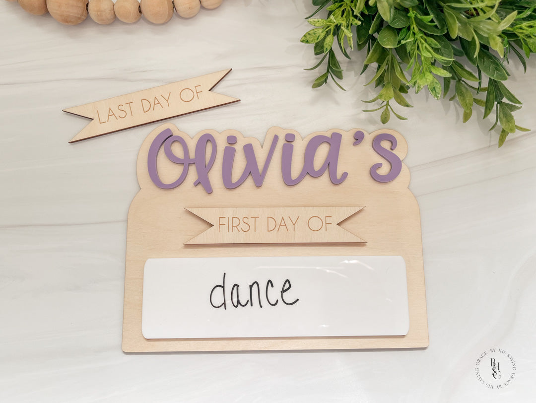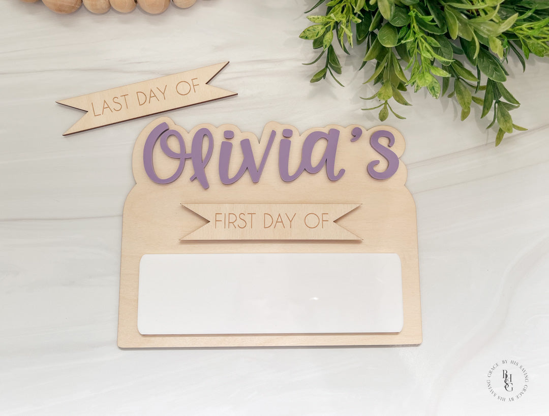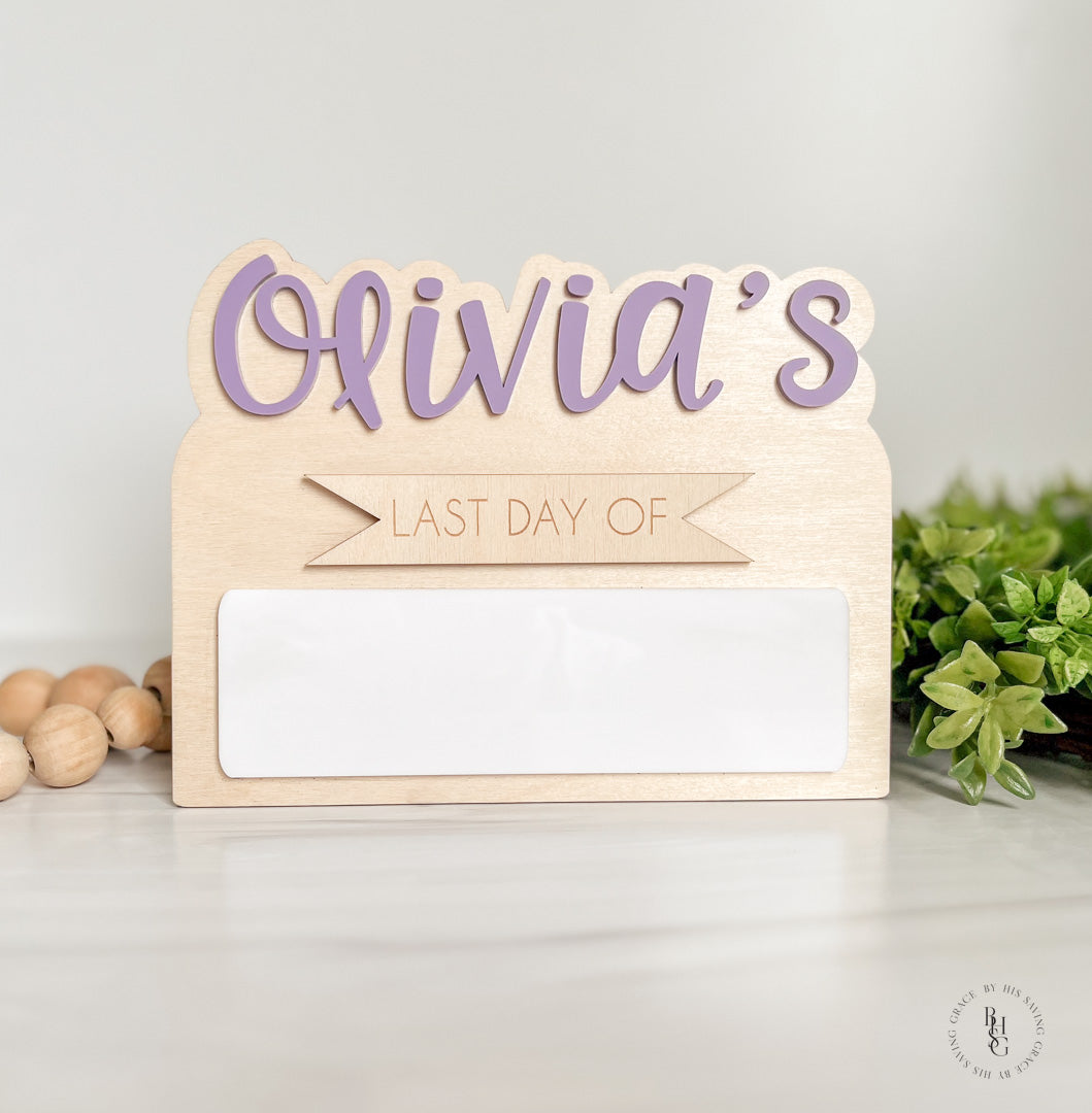 Our laser-cut personalized interchangeable first day of and last day of sign is universal and can be used to document from school to sports, this dry-erase sign covers all of life's moments we want to celebrate. It features acrylic that doubles as a dry-erase board. Write on the acrylic using Expo markers and wipe off the acrylic with a damp cloth or dry-erase board cleaner when ready! The first day of and last day of are attached with Velcro, making them easy to switch out.