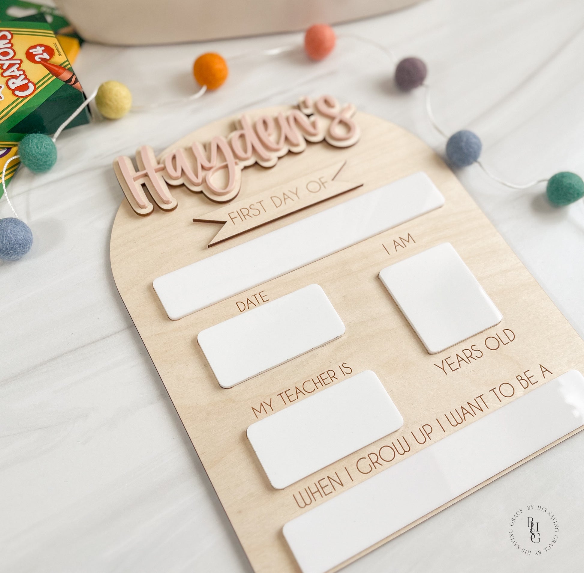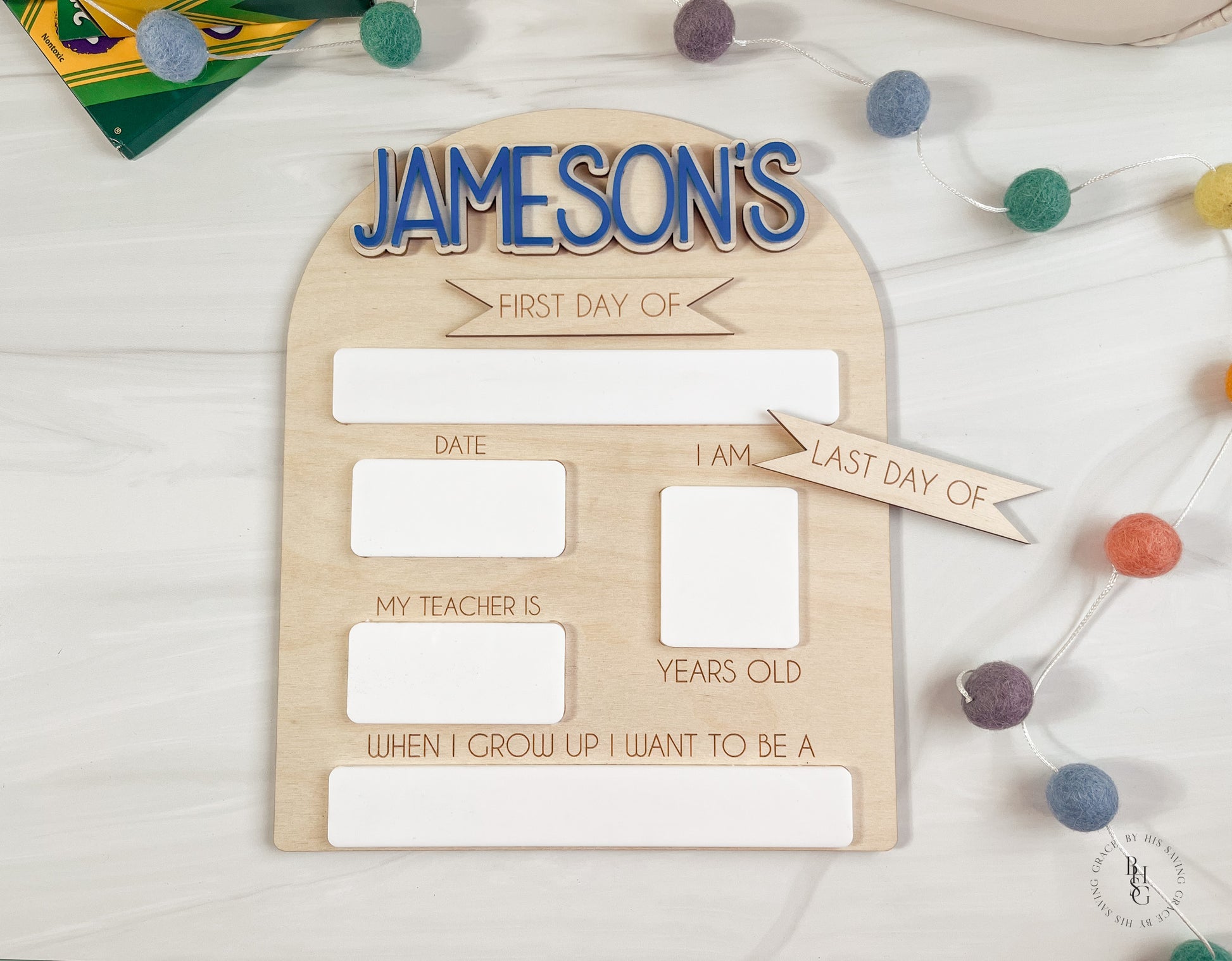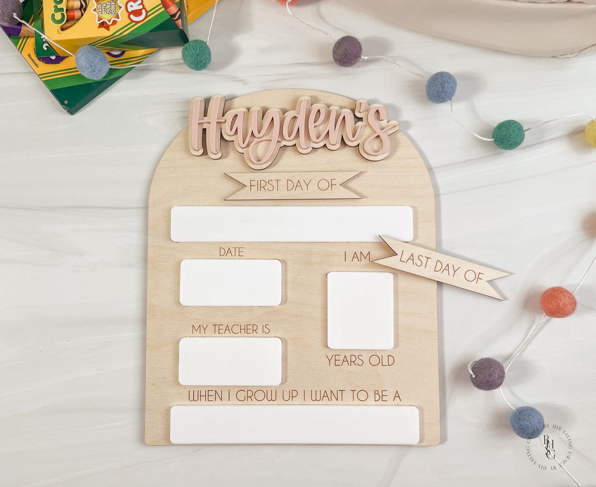 Our laser-cut and engraved interchangeable first and last day of school sign is the perfect prop to help capture those first and last day of school pictures. It features acrylic that doubles as a dry-erase board. Write on the acrylic using Expo markers and wipe off the acrylic with a damp cloth or dry-erase board cleaner when ready! The name(s) and first day of and last day of are attached with Velcro, making them easy to switch out.