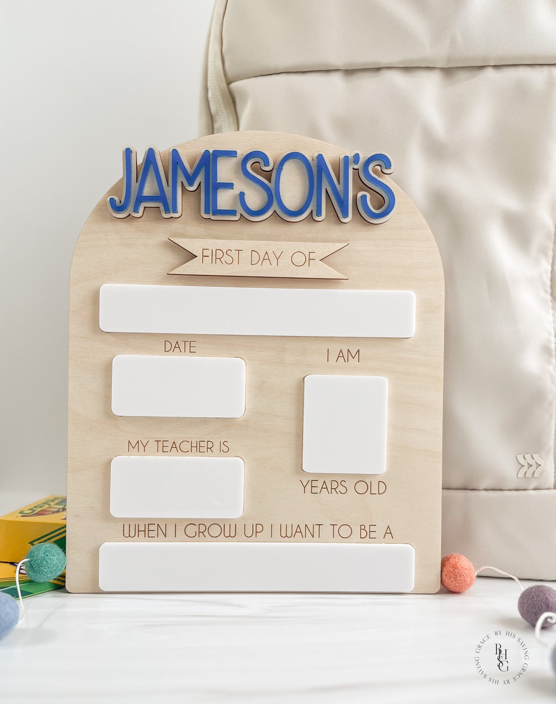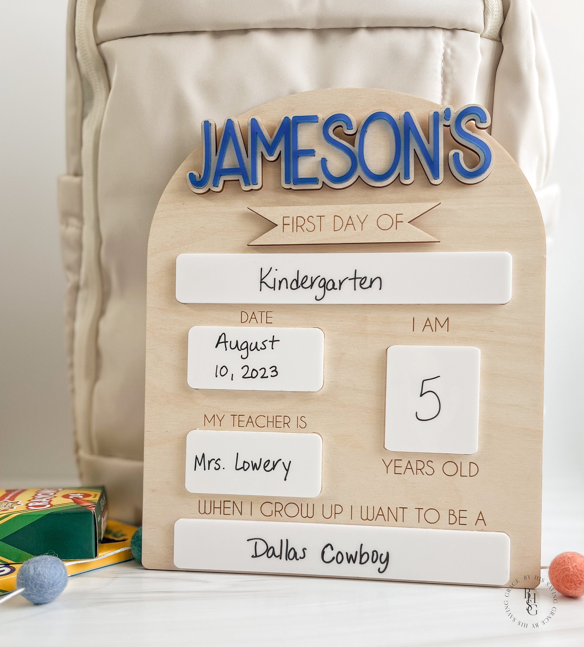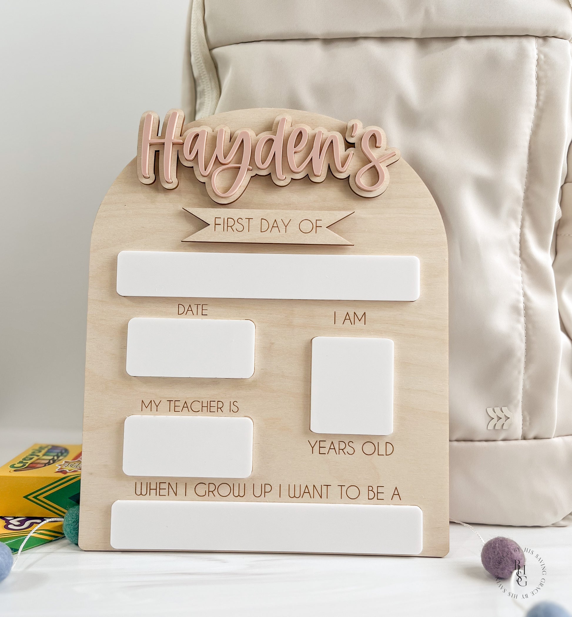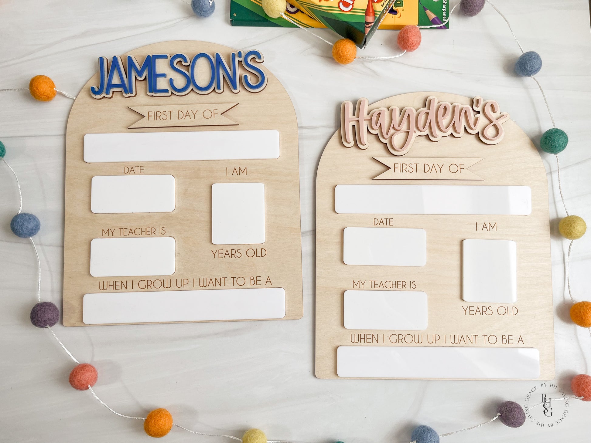 Our laser-cut and engraved interchangeable first and last day of school sign is the perfect prop to help capture those first and last day of school pictures. It features acrylic that doubles as a dry-erase board. Write on the acrylic using Expo markers and wipe off the acrylic with a damp cloth or dry-erase board cleaner when ready! The name(s) and first day of and last day of are attached with Velcro, making them easy to switch out.