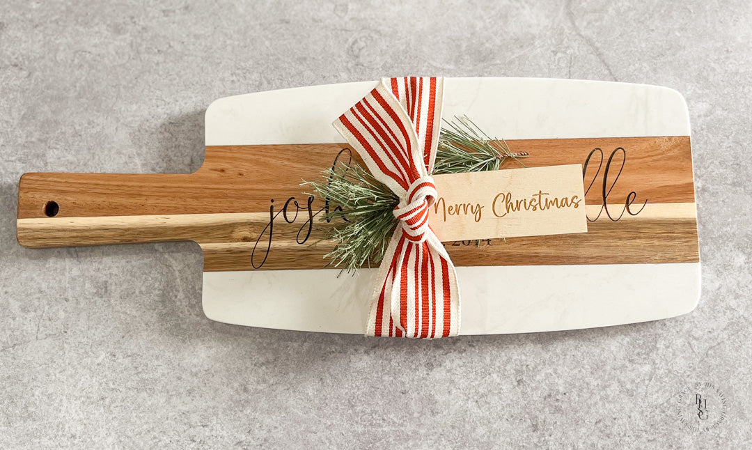 -Each board will include a laser-engraved wooden tag, ribbon, and greenery. The ribbon and greenery will vary from what is seen in the listing photos.