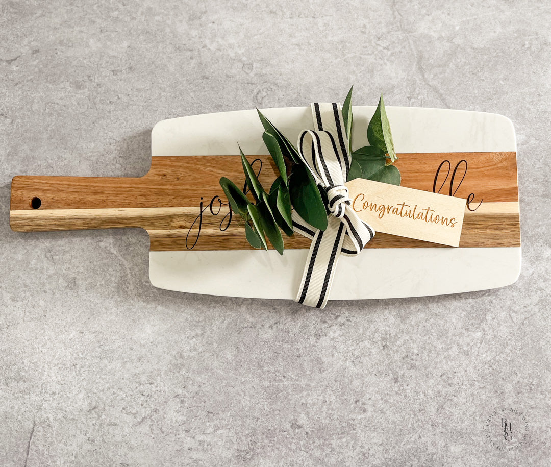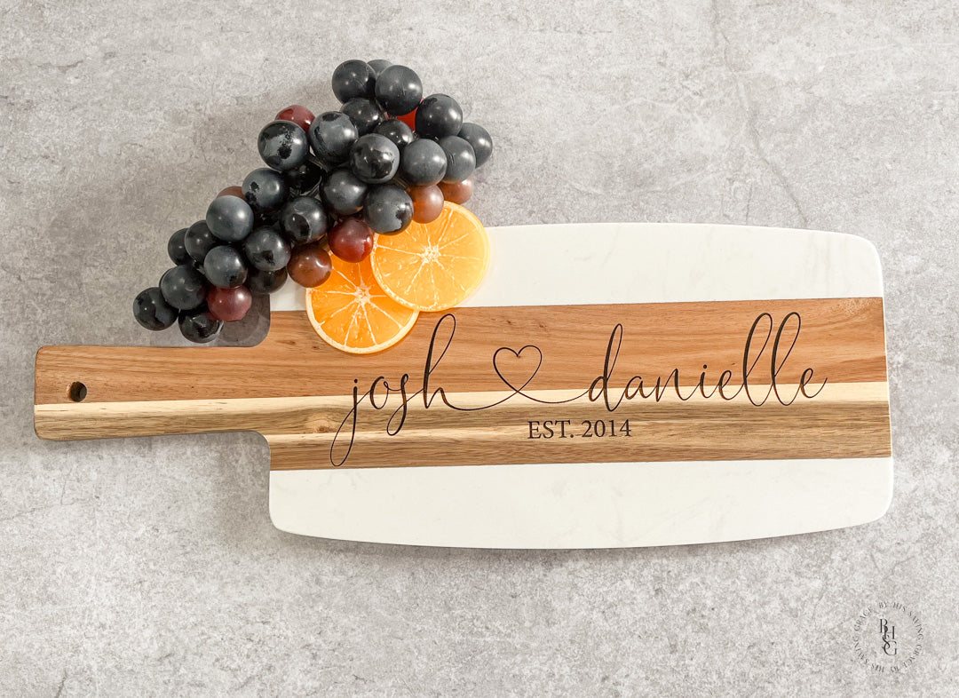 Our laser-engraved marble and acacia wood serving board is engraved with your name and date of choice. This beautiful board can be used to serve cheese, hors d'oeuvres, appetizers, and desserts. This custom serving board is a perfect gift for a new couple, a housewarming gift, or a client gift, to name a few.