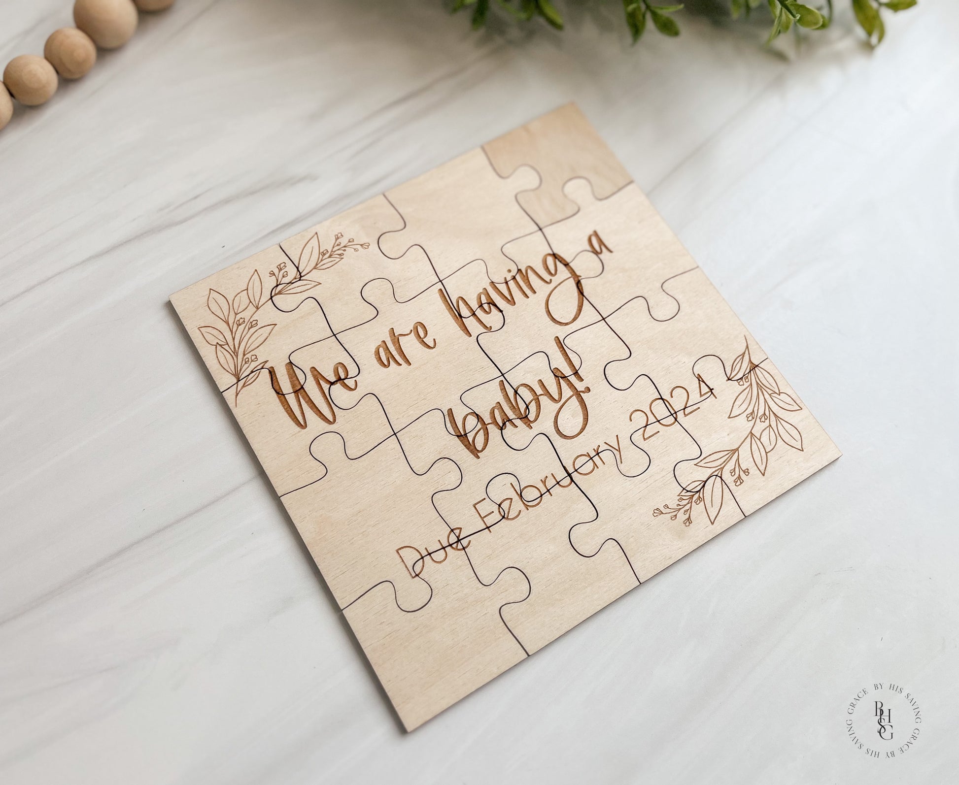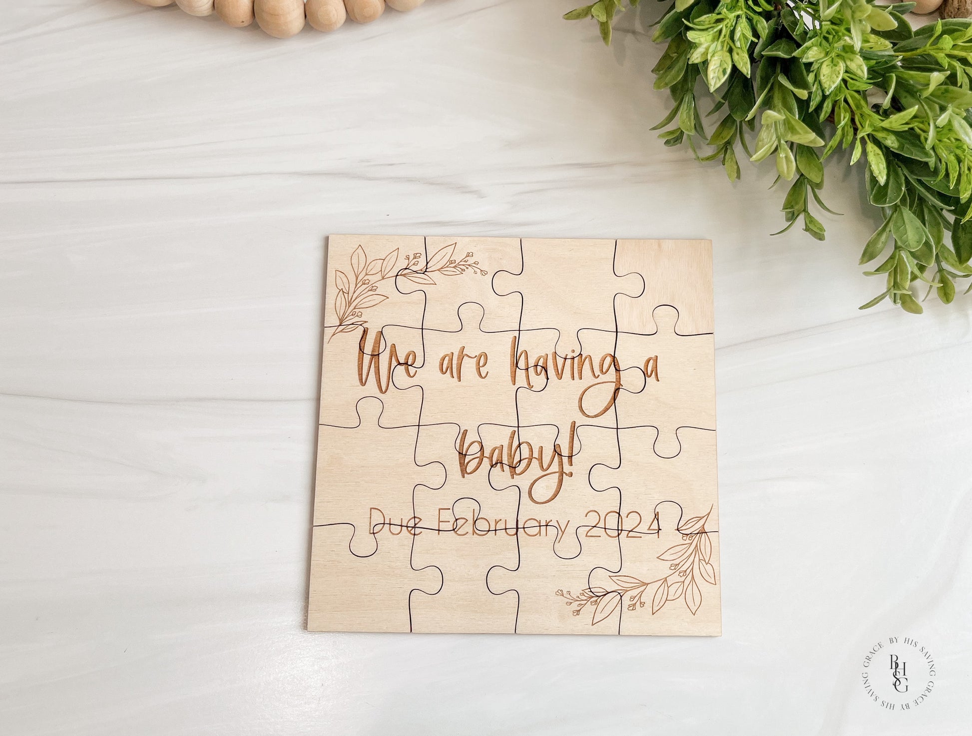 Announce your pregnancy with our laser-cut and engraved "We are having a baby!" pregnancy announcement puzzle. This puzzle is a fun and interactive way to announce that you're expecting.